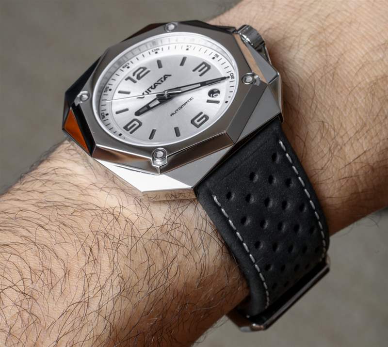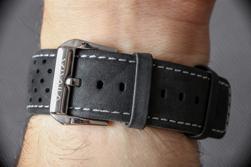 如果沒有傳統的表耳,44 毫米寬的表殼比您想象的要小,而且看起來也比其大約 13 毫米的厚度可能暗示的要薄。這種更纖細的佩戴輪廓可以歸因于表殼的錐形特性,其中中間部分比頂部或背面更寬。鑒于此表殼尺寸,22 毫米寬的表耳可制成合適尺寸的表帶。Virata 提供帶有一些對比色縫線的黑色穿孔皮革表帶。表帶在幫助表殼感覺運動和現代方面做得很好,但我認為創意所有者可能會找到其他表帶,幫助手表更好地適應他們的個性(除非你穿了很多穿孔的衣服或配飾)。