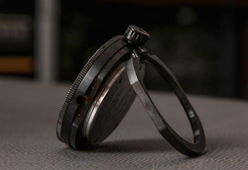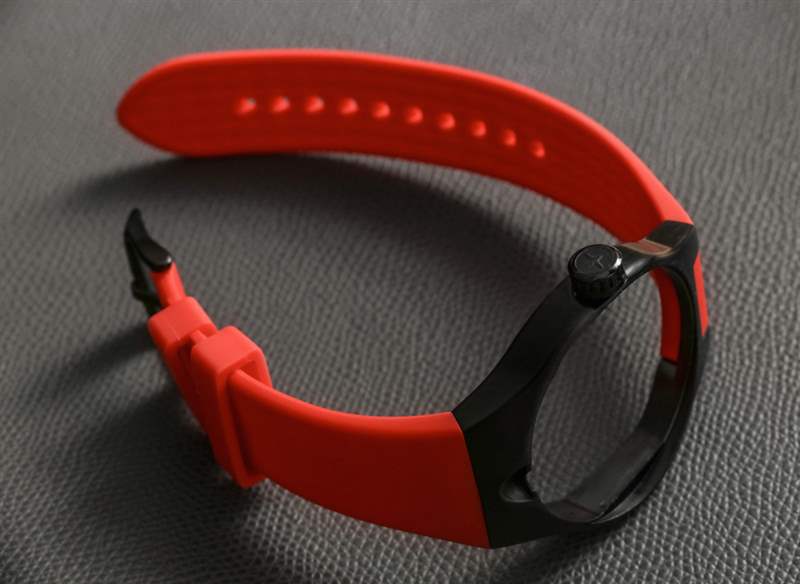 用于操作手表本身的表冠位于表殼 12 點鐘位置,而 3 點鐘位置的表冠實際上是用于將內殼固定到外殼的螺釘。擰下 3 點鐘位置的表冠可讓您輕松取下手表——即使在佩戴表帶時也是如此。取下內殼后,可以將環形腿從表殼中鉸出來,讓您可以將手表放在桌子上作為小時鐘。