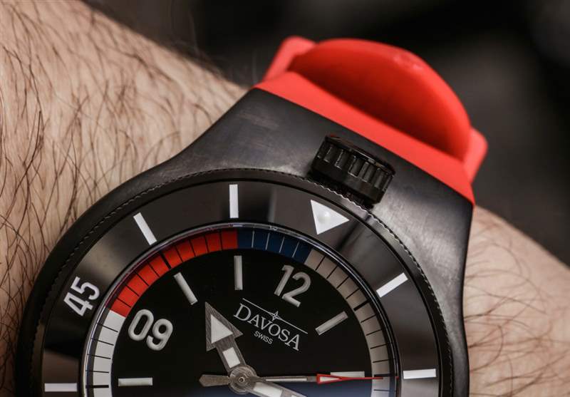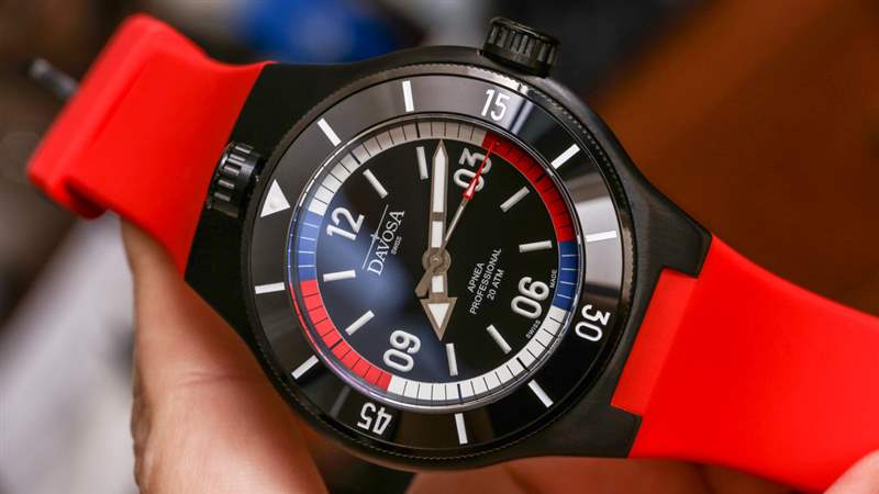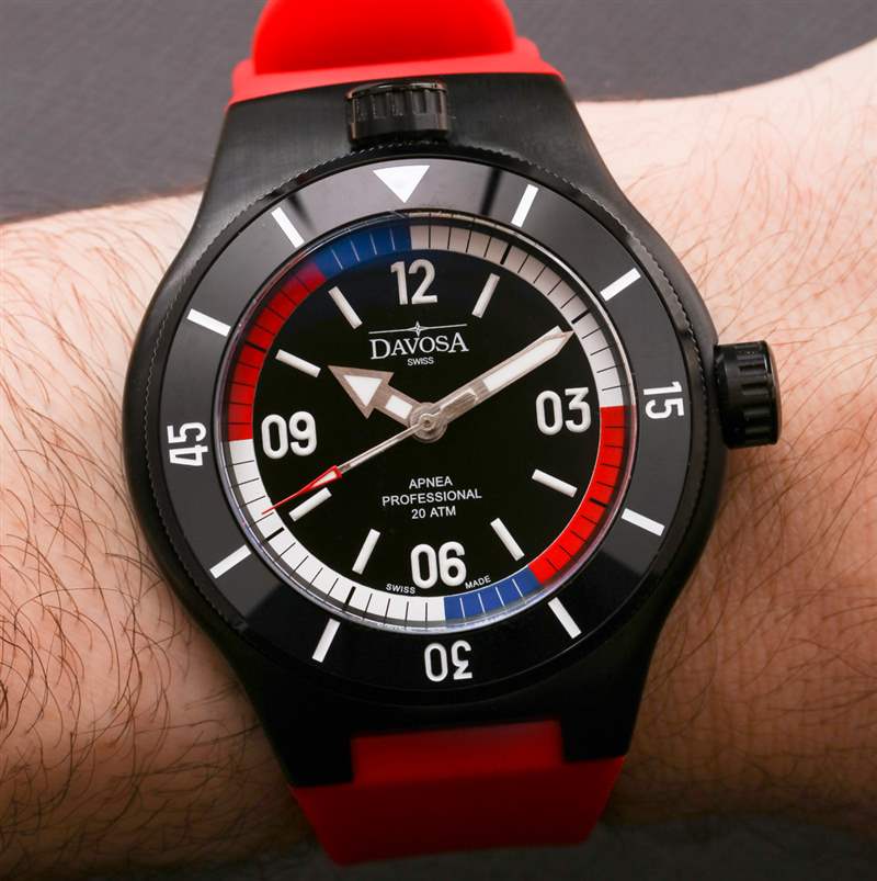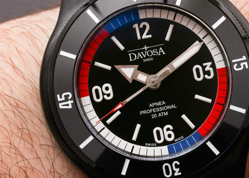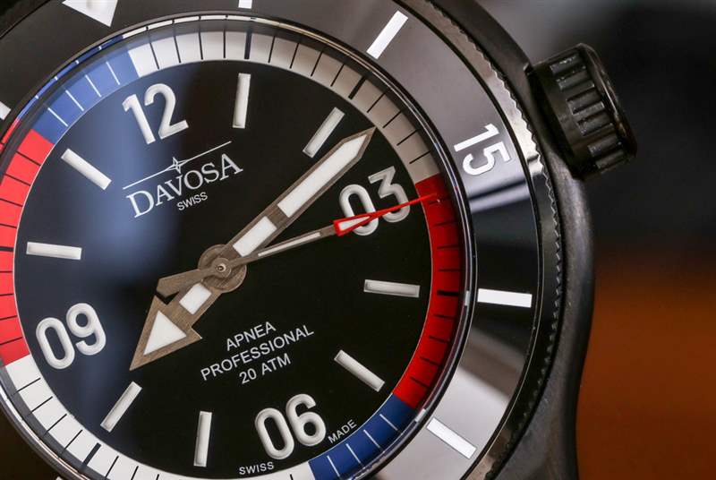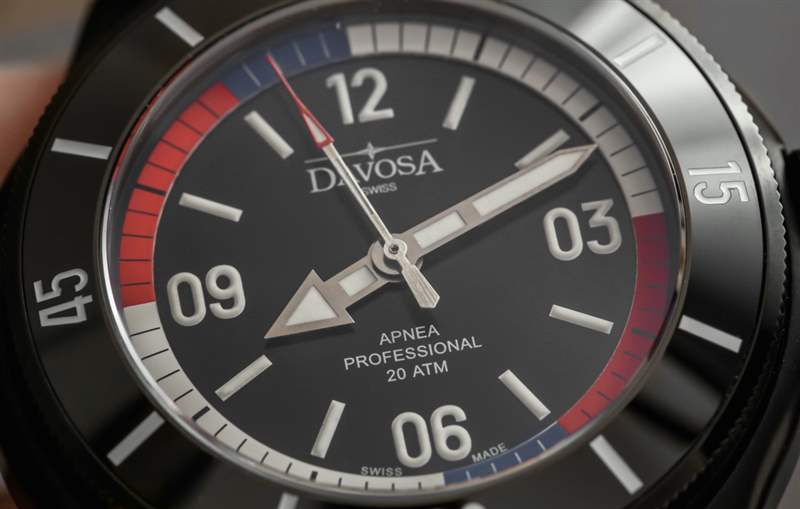 對于那些不打算用你的手表練習自由潛水呼吸技巧的人來說,有漂亮的顏色可以看,當然看起來像是一系列國旗顏色(從美國到法國等等)。Davosa 否則選擇使表盤干凈和對稱。沒有日期,由于面部比例合適,材料和對比度的使用良好,易讀性非常好。表盤本身可能不如 Apnea Diver 的整體構成那么原始,但它工作得非常好。使用刷過的指針是正確的選擇,我喜歡在時標上使用厚厚的 Super-LumiNova 涂料。外部的“呼吸暫停環”也被應用,因此它有助于給表盤一種很好的深度感。