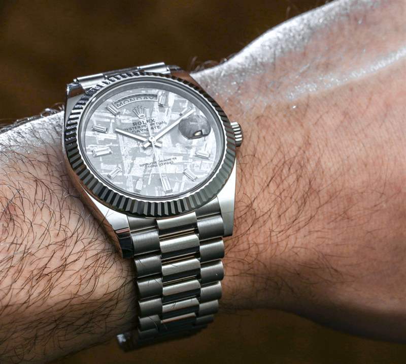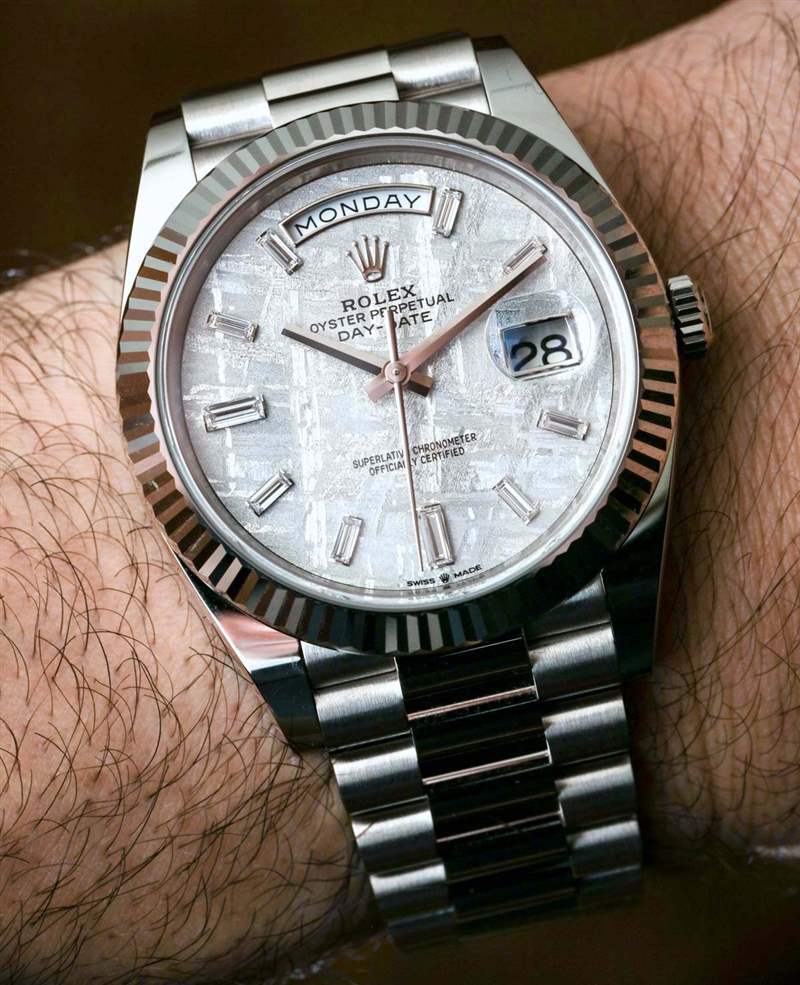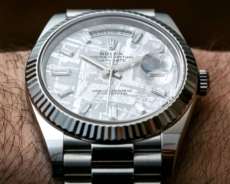 我發(fā)現(xiàn)隕石表盤是勞力士 Day-Date 40 主題的美麗而引人注目的補(bǔ)充。勞力士只使用最優(yōu)質(zhì)的材料,尤其是其高端系列,因此您會得到一塊既清晰又實(shí)用的絕妙天然材料。這款腕表的一大魅力在于將稀有材料積聚在一個產(chǎn)品中,因為它結(jié)合了 18ct 白金、鉆石和隕石,所有這些都被認(rèn)為是珍貴的材料。雖然這些材料的實(shí)際市場稀缺性存在爭議,但將這些材料整合在一起的目的之一是提高手表的內(nèi)在價值。