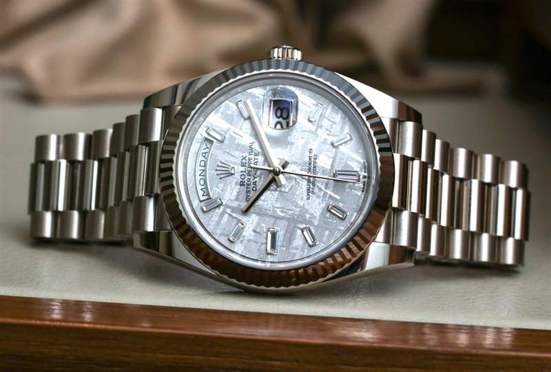 白金是一種非常奢華的材料,但它通常看起來并不比鋼多。白金的重量增加意味著它的佩戴方式與鋼不同,但除非你碰巧身邊有一位知道 Day-Date 40 只有黃金和鉑金的手表愛好者,否則這款手表很容易被誤認(rèn)為是不銹鋼。引人注目的隕石表盤上鑲有鉆石,這款特別的勞力士總裁腕表在奢華與精致之間劃清了界限,進(jìn)一步增添了它的個性和個性。