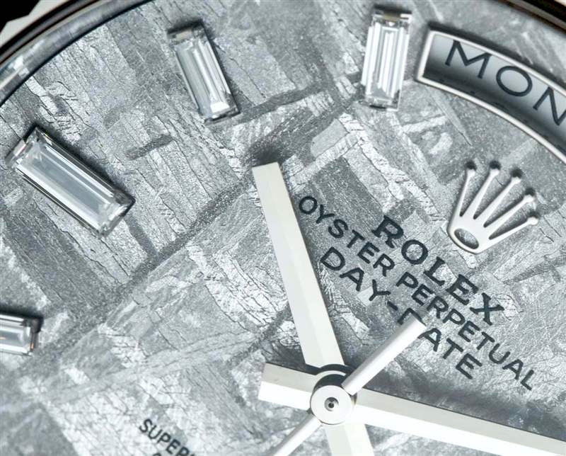 勞力士將這款隕石表盤與長方形切割鉆石時標(biāo)配對,使其成為一款奢華而優(yōu)雅的時計。添加裝飾元素,如鉆石,很難保持手表的陽剛氣質(zhì),但鉆石時標(biāo)的微妙之處使其發(fā)揮作用。當(dāng)然,表盤在 12 點(diǎn)鐘位置設(shè)有星期窗口,在 3 點(diǎn)鐘位置設(shè)有日期窗口。事實(shí)上,當(dāng)勞力士 Day-Date 腕表最初于 1956 年問世時,它是第一款配備同時顯示日期和星期幾的表盤的腕表。廣告訊息廣告信息結(jié)束