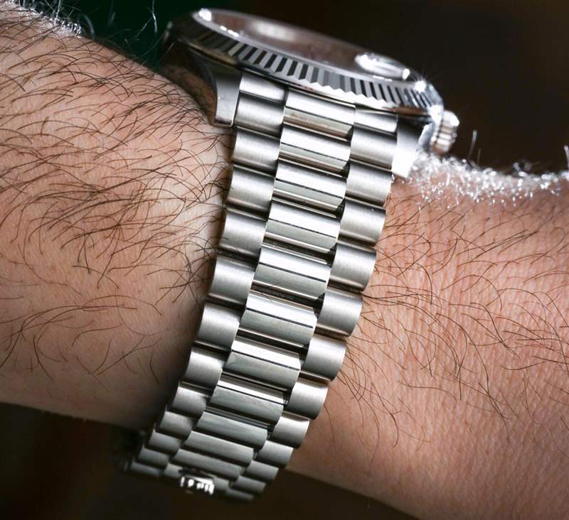 Day-Date 40 ref 寬 40 毫米,不是特別厚。228239 穿得很好看。手表在視覺上比實(shí)際要小的原因之一是表鏈的寬度似乎縮小了表殼的尺寸,這符合勞力士強(qiáng)調(diào)總統(tǒng)表鏈的愿望。這款圓形三鏈?zhǔn)绞宙湸髟谑滞笊戏浅J孢m,得益于“隱藏”的展開式表扣,從頭到尾看起來都一樣。