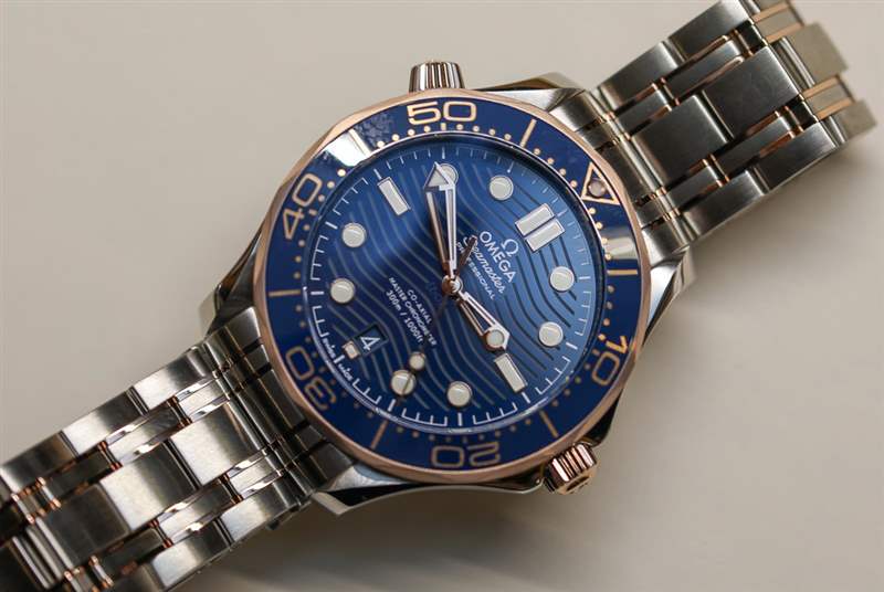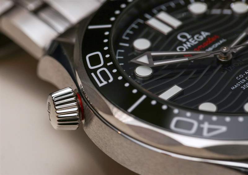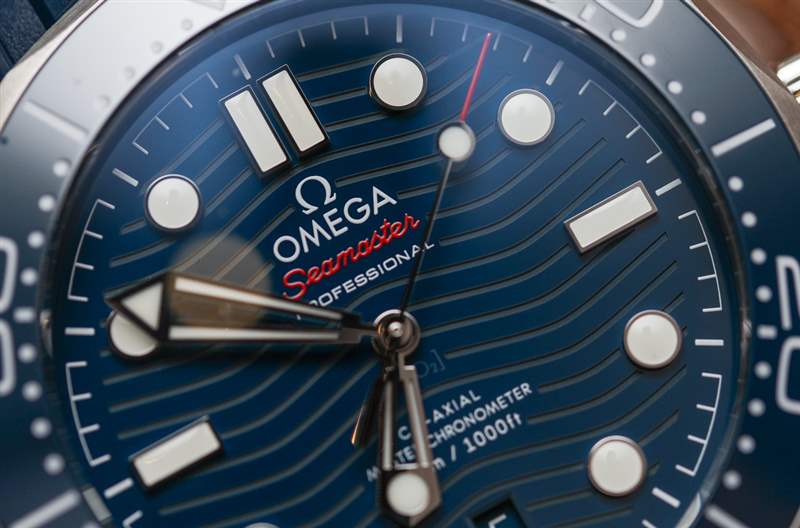 2018 年款 Seamaster 300M 表盤的一項變化是日期窗口的位置,現在位于 6 點鐘位置(相對于 3 點鐘位置)更加對稱。歐米茄還告訴我們,存在新規則,即潛水表需要在所有 12 小時標記處都有發光點。因此,海馬 300M 在日期窗口下方有一個小時標。根據這些新規則,鑒于大多數型號的日期窗口取代了 3 點鐘位置的小時指示器,Submariner 不會通過。
