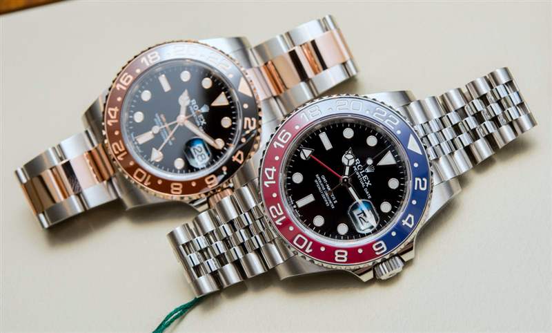 鑒于與百事可樂軟飲料標志的顏色相似,勞力士表迷將紅色和藍色表圈 GMT-Master 稱為“百事可樂表圈”。勞力士在 1954 年最初發布 GMT-Master 時實際上引入了雙色表圈,當時他們與泛美航空公司的飛行員合作生產。格林威治標準時間 24 小時制腕表旋轉表圈上的兩種顏色的目的是指定第二時區的晝夜時間。從那時起,勞力士在 GMT-Master 手表上試驗了各種單色和雙色表圈。最新的是鋼 116710BLNR 上的藍色和黑色表圈。為什么他們不直接使用紅色和藍色表圈?
