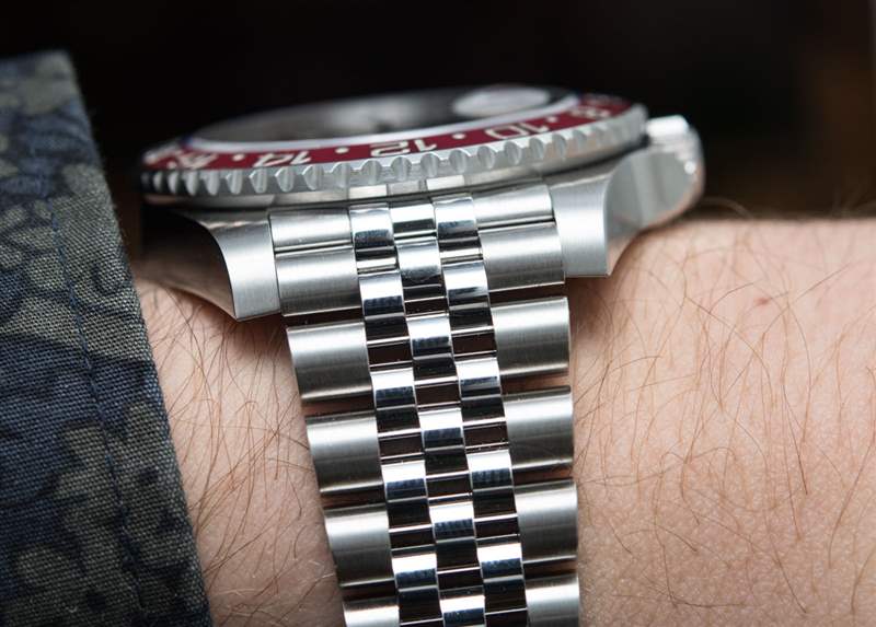 40 毫米尺寸(防水深度達 100 米)戴在手腕上感覺很棒,而且表殼本身繼續感覺纖薄,但在佩戴時仍具有陽剛之氣。勞力士的三連桿或 jubilee 手鏈在許多手表上都非常有效,因此將 GMT-Master II 與 jubilee 手鏈再次配對似乎是有道理的也就不足為奇了。