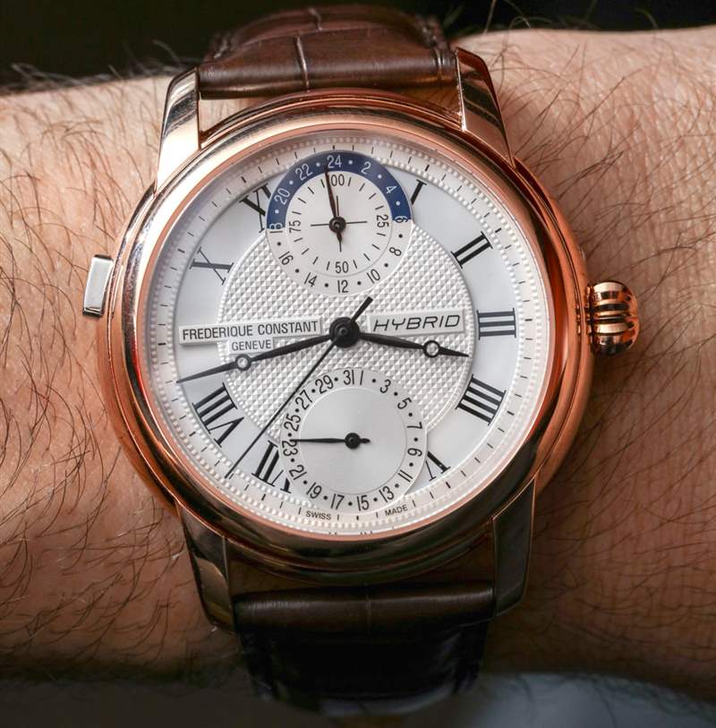 Frederique Constant Hybrid Manufacture 手表一目了然,看起來很像該品牌當前的許多其他型號,完全是機械的。其他模擬表盤上沒有數字屏幕,除了表盤上的“混合”文字外,手表的視覺呈現似乎沒有任何“技術”。看看手表內部,看看全新的康斯登自制機芯 FC-750,您會看到一個非常有趣的系統。簡而言之,康斯登設法將其兩個產品類別組合成一個新的產品類別——以一種相當聰明的方式,而不是明顯成功的方式。