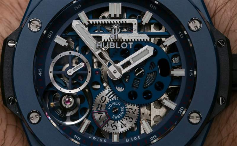 對于它的價值,宇舶試圖分享一個事實,即這是一款手表,其機芯設計為原創,并且在寫作時看起來很酷:“Big Bang Meca-10 藍色陶瓷的機械結構與構成它們的材料一樣具有創新性。歷時兩年研發的手動上鏈鏤空機芯擁有 10 天動力儲存,包含 223 個零件。作為美感和技術專長的證明,它有兩個平行于動力儲存指示器的發條盒:一個齒輪系統,帶有兩個沿水平軸滑動的耙子。為突顯這一機械結構,當機芯接近動力儲存的最后幾天時,3 點鐘位置的開口會顯露一個紅點,而 6 點鐘位置的齒輪則指示剩余的確切天數,而調節機構則結合在一起帶有小秒針調節器,出現在 7 點鐘位置。”