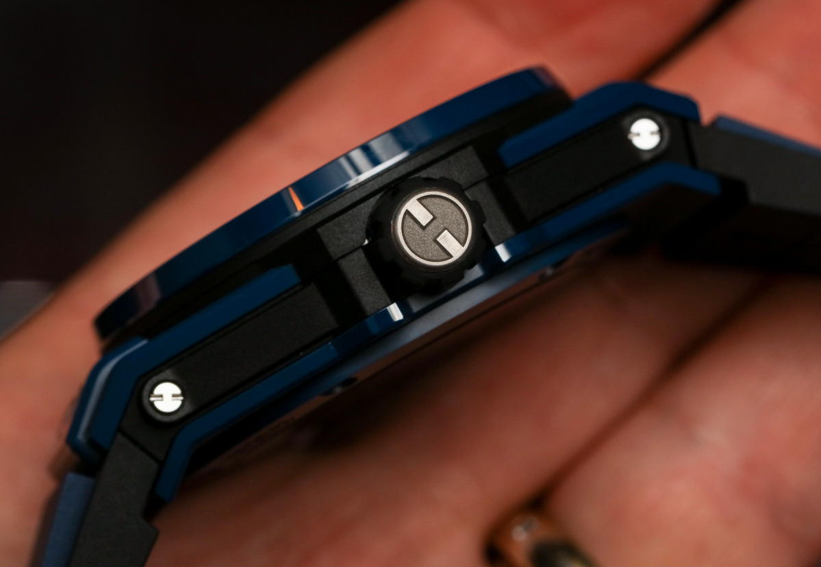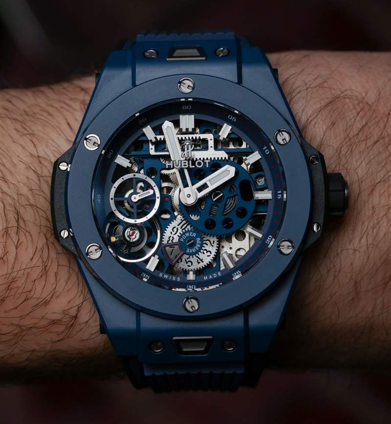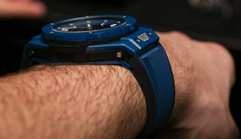 Meca-10 寬 45 毫米,厚 15.95 毫米(防水深度達 100 米),存在于標準的現代一代 Big Bang 表殼中。我的一部分希望這個機芯有自己的外殼,但我完全同意它借用大爆炸的個性作為機制的框架。宇舶目前提供的 Big Bang Meca-10 有多種款式,包括黑色陶瓷、鈦金屬、魔力金、王金,以及現在的藍色陶瓷作為參考 414.EX.5123.RX。藍色仍然是豪華手表領域的熱銷品,因此預計未來幾年宇舶和幾乎所有其他手表品牌都會看到更多這種色調。藍色陶瓷對于陶瓷手表來說仍然是一種相對不常見的顏色,因此現在這樣的手表具有明顯的新奇價值。
