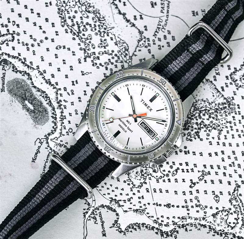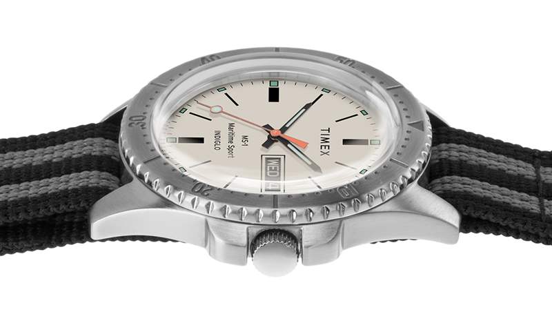 MS1 Maritime Sport 腕表采用 41 毫米寬的精鋼材質。黑色表盤搭配黑色精鋼表殼,而銀色表盤搭配天然精鋼表殼。兩者都有旋轉潛水表圈。這些手表是運動型的,但不一定可以潛水,只有 30m 的防水深度。然而,它們確實具有 Timex 有用的 INDIGLO 表盤背光照明系統(通過按下表冠激活)。MS1 Maritime Sport 手表內部是 Timex 石英機芯,帶有時間、星期幾和日期。