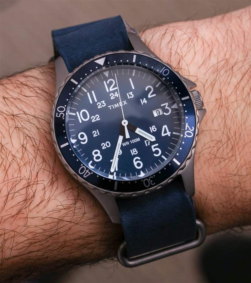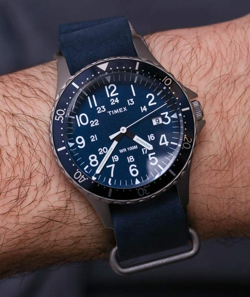 鋼制 38 毫米寬(采用緞面處理,防水 100 米),這是一款中等尺寸的潛水員風格運動手表,帶有復古風格。尋找“中型”手表的人在這里會很自在。盡管發現缺少較小手表的人可能會認為 Navi Ocean 有點小。然而,Timex 確實生產寬達 43 毫米的大型軍用手表。就個人而言,我認為 Timex 應該考慮制作 40 或 41mm 寬的 Navi Ocean 版本,它還帶有旋轉表圈和至少 100m 的防水性能,表盤略有不同。我這樣說是因為我認為有很多人會穿稍微大一點的模型,考慮到這個產品的主題,他們會覺得恰到好處。