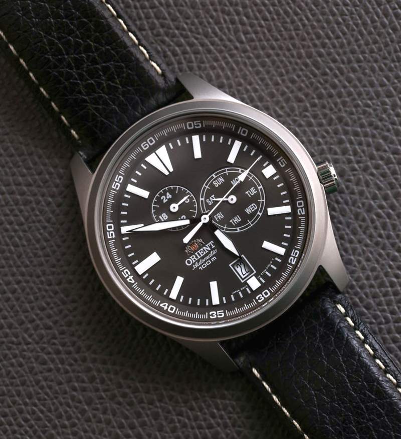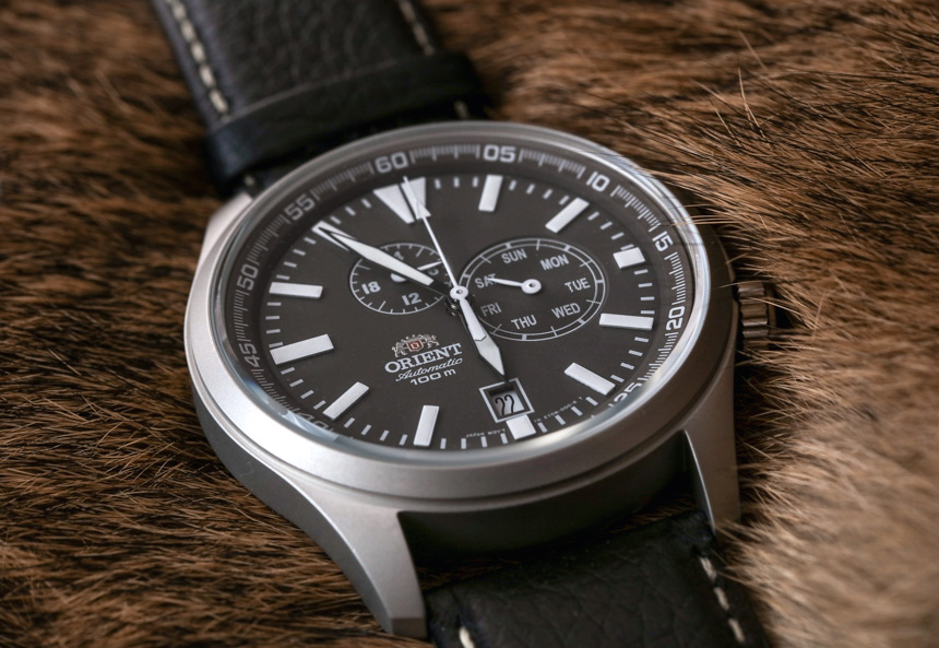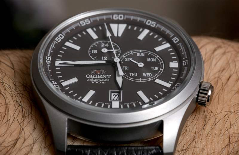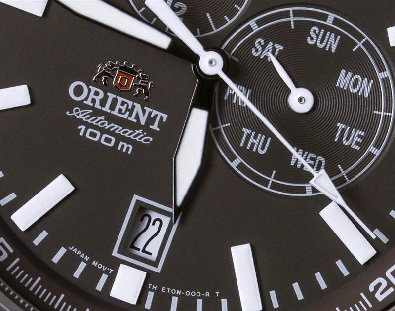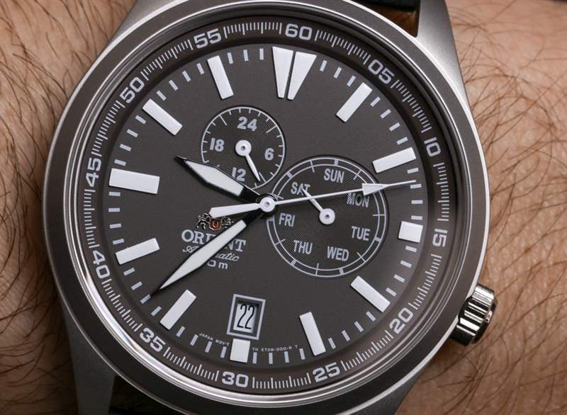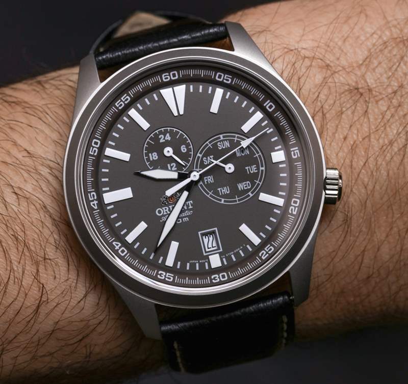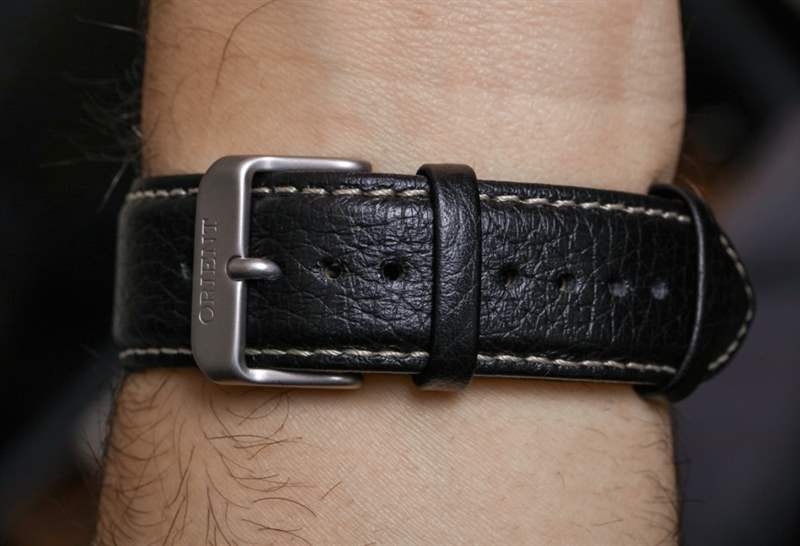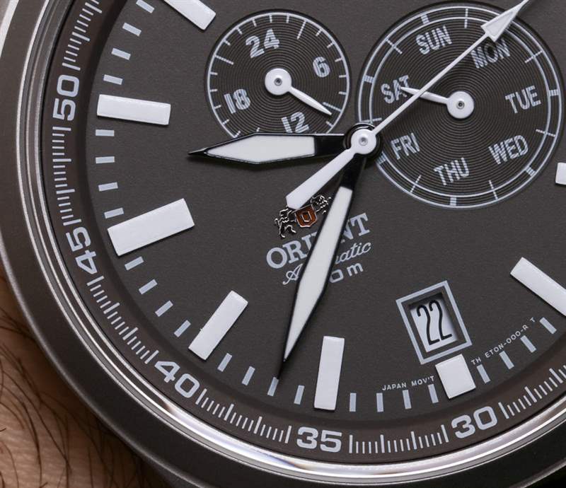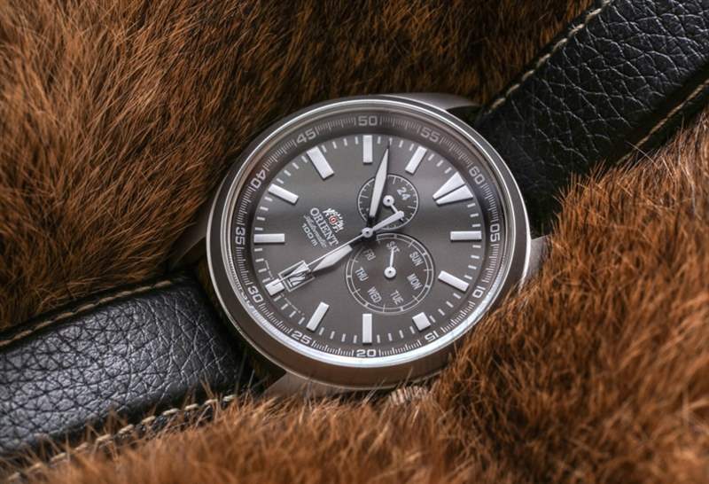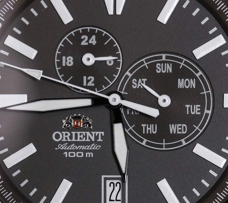 AM/PM 指示器(24 小時小表盤)有兩個用途。首先,如前所述,它是一個方便的 AM/PM 指示器,因為 24 小時時間與主時間同步。其次,它有助于滿足幾乎無處不在的要求,即野外手表具有軍用時間刻度。與大多數將這個刻度放在主小時標記旁邊的野外手表不同,Orient 巧妙地為此使用了子表盤。