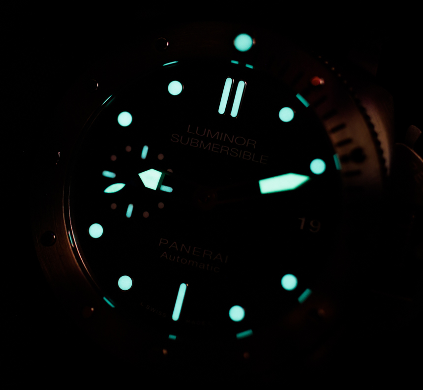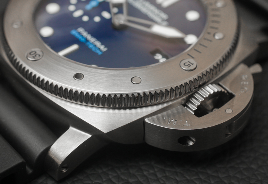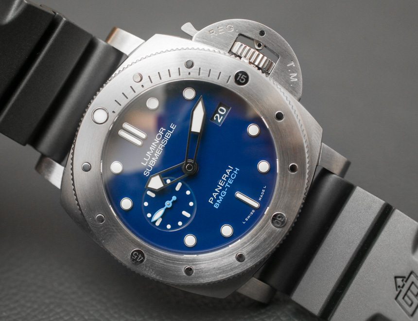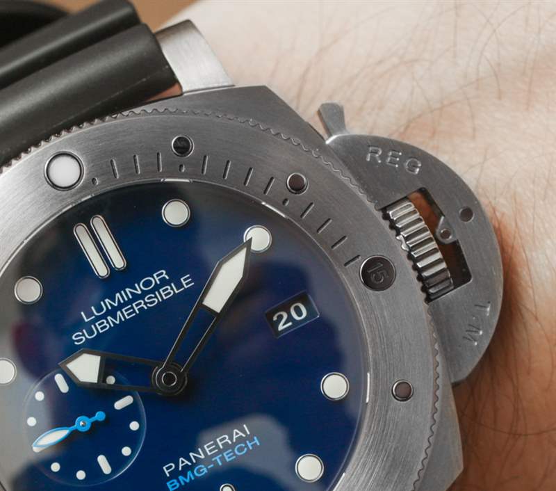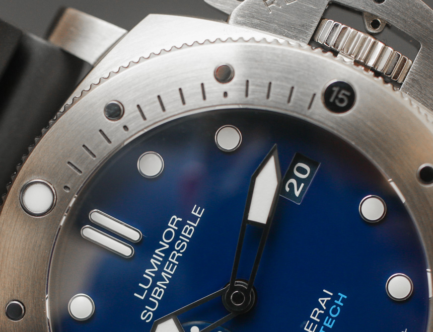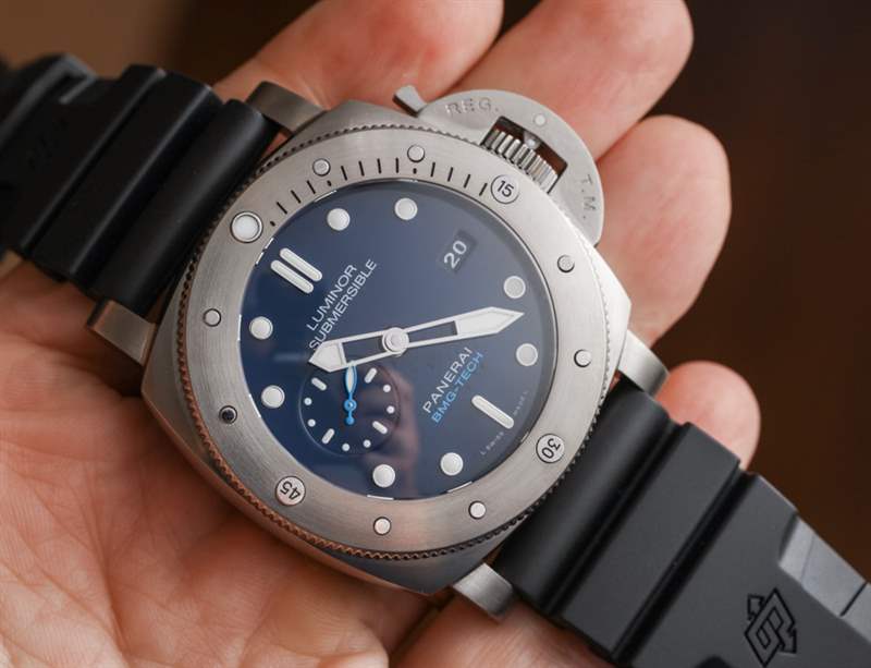 大塊金屬玻璃外殼寬 47 毫米——是的,它穿起來很大(但很舒服)。據我們所知,外殼尺寸與任何其他 Luminor Submersible 1950 型號相同。在 300 米防水表殼內是一個內部制造的沛納海 P.9000 自動機芯,具有三天的動力儲存。在風格上,表盤以藍色為標志,包括深藍色表盤,淺藍色調與鋼色元素混合。