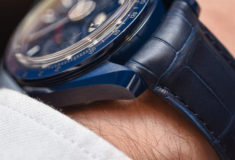 自從最初的 Speedmaster Dark Side Of The Moon(帶有性感的黑色陶瓷表殼)幾年前在 Baselworld 引起轟動以來, “月亮的(顏色)面”已經成為歐米茄的流行語。歐米茄熱切地嘗試通過一系列不同的設計來保持彩色陶瓷表殼的趨勢。甚至 Seamaster Planet Ocean 潛水表也有黑色或藍色陶瓷表殼可供選擇。歐米茄 Speedmaster Blue Side Of The Moon 是 2017 年最新推出的陶瓷超霸腕表——實際上也是唯一一款全新的陶瓷腕表。根據典型的歐米茄慣例,手表的官方(全名)名稱是歐米茄超霸藍色月球同軸主計時計時碼表月相。