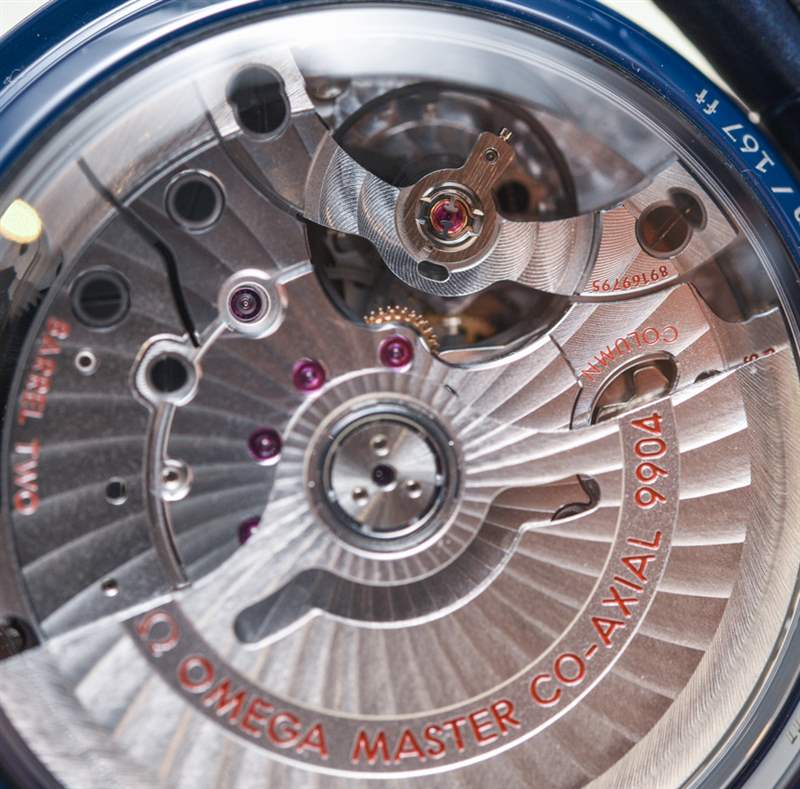 由于我們之前已經介紹過核心的超霸同軸至臻天文臺計時月相腕表,因此我不打算詳細討論機芯或腕表的功能。回想一下,9904 型機芯在計時碼表和日期復雜功能中增加了月相指示器。機芯表盤布局的對稱性令人印象深刻,令人向往。注意每個子表盤如何有兩只手。這確實是迄今為止最有趣和最吸引人的現代歐米茄機芯之一。當然,它具有同軸擒縱系統、METAS 認證(以及與之相關的一切)、4Hz 工作頻率和 60 小時的動力儲備。通過底蓋的藍寶石水晶窗可以輕松欣賞到機芯。