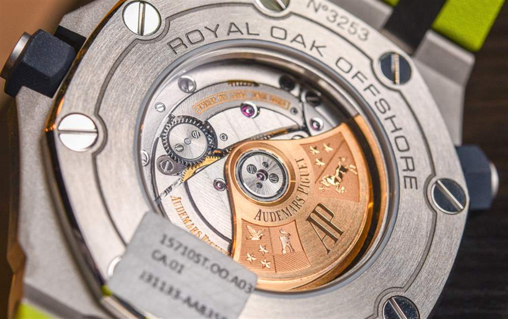 Audemars Piguet Royal Oak Offshore Diver 內(nèi)部裝有 Audemars Piguet calibre 3120 自動(dòng)機(jī)芯。它以 3Hz (21,600bph) 的頻率運(yùn)行,動(dòng)力儲(chǔ)存為 60 小時(shí)。這些總是具有可愛的修飾和裝飾程度,愛彼保持了 300m 的防水性能,同時(shí)提供了藍(lán)寶石水晶顯示底蓋,可以看到機(jī)芯和鐫刻 22k 金轉(zhuǎn)子。