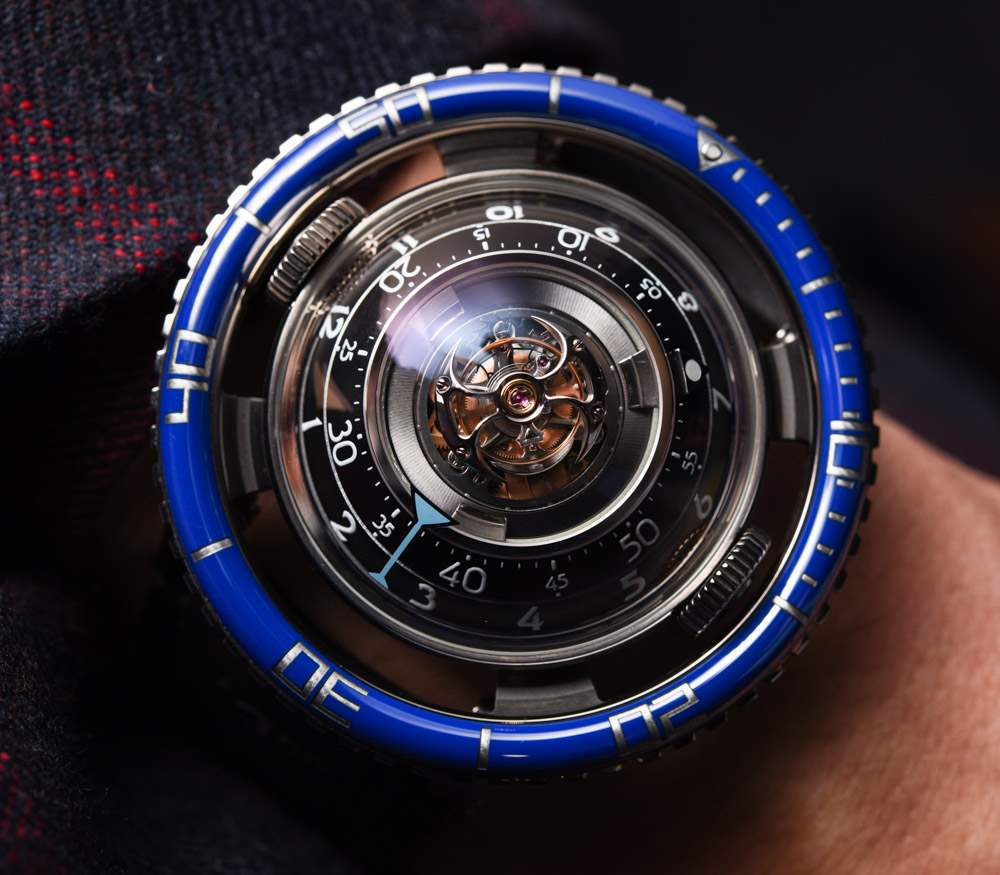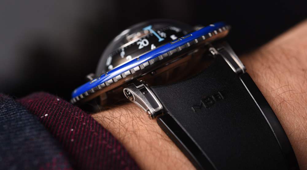 您越仔細觀察旋轉表圈和顯示時間的旋轉環,您就越能意識到對傳統潛水表的所有微妙點頭——比如勞力士潛航者,但不僅限于此。使用的字體是 MB&F 獨有的,但你可以看出數字布局和設計的靈感完全來自于多年來欣賞潛水表外觀和感覺的人。甚至分鐘環上的 60 分鐘指示器也是一個帶有夜光點的應用三角形,您可以在許多嚴肅的潛水時計的表圈上找到這種風格。
