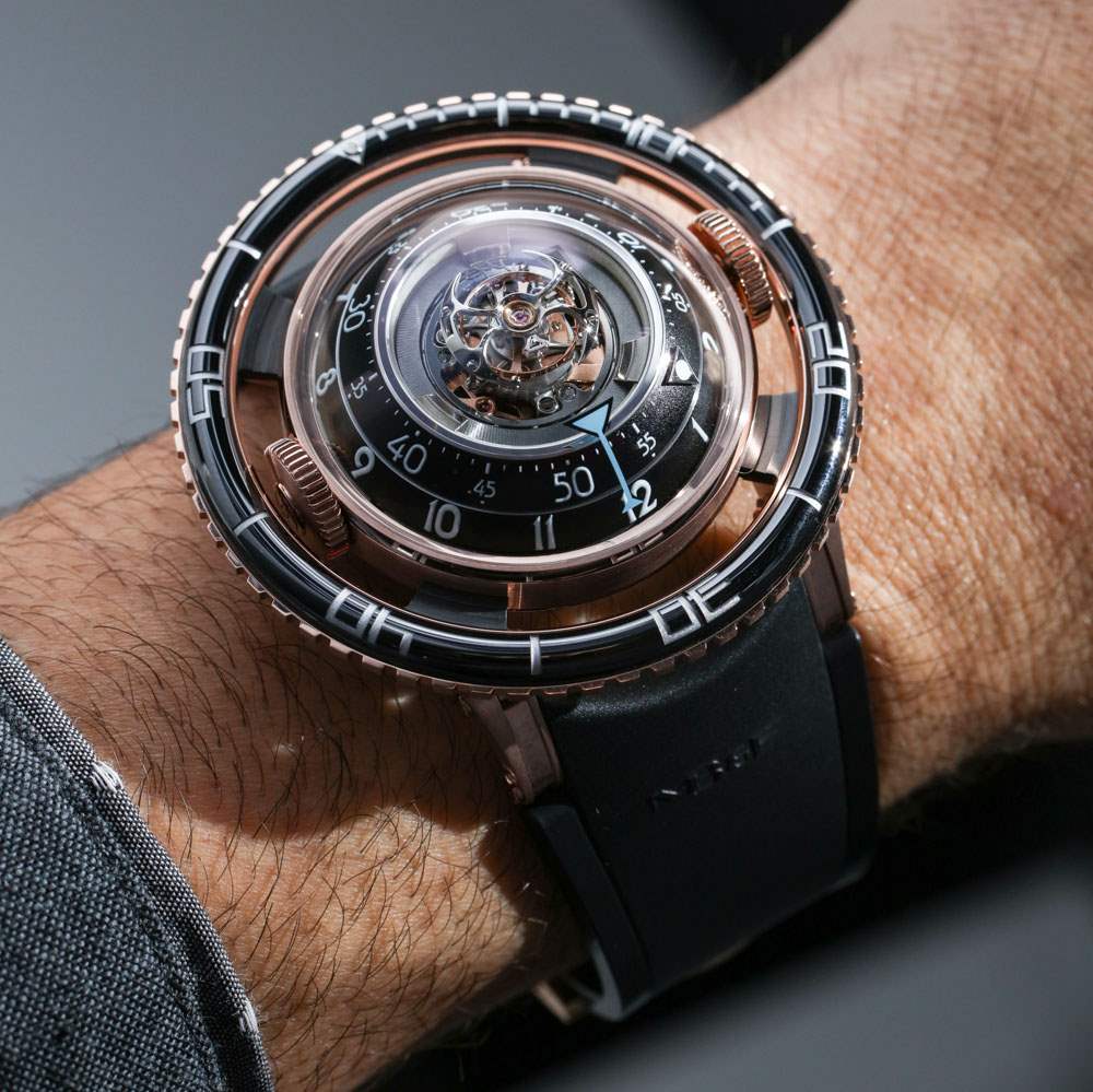 話雖如此,我認為正是因為我喜歡潛水表(和 MB&F),MB&F HM7 Aquapod 才像它一樣吸引我。我通常相信 Max Busser 和 Eric Giroud(實際設計師)的設計敏感性,所以 MB&F HM7 Aquapod 所做的就是結合了至少兩件我熱愛的事情。它在視覺上也很狂野,包括一個內部球形表殼和一個飛行陀飛輪,立即由多個指示時間的角度環構成,以及一個旋轉潛水員風格的金屬和陶瓷計時表圈,感覺就像 MB&F 對勞力士 Submariner 的致敬。