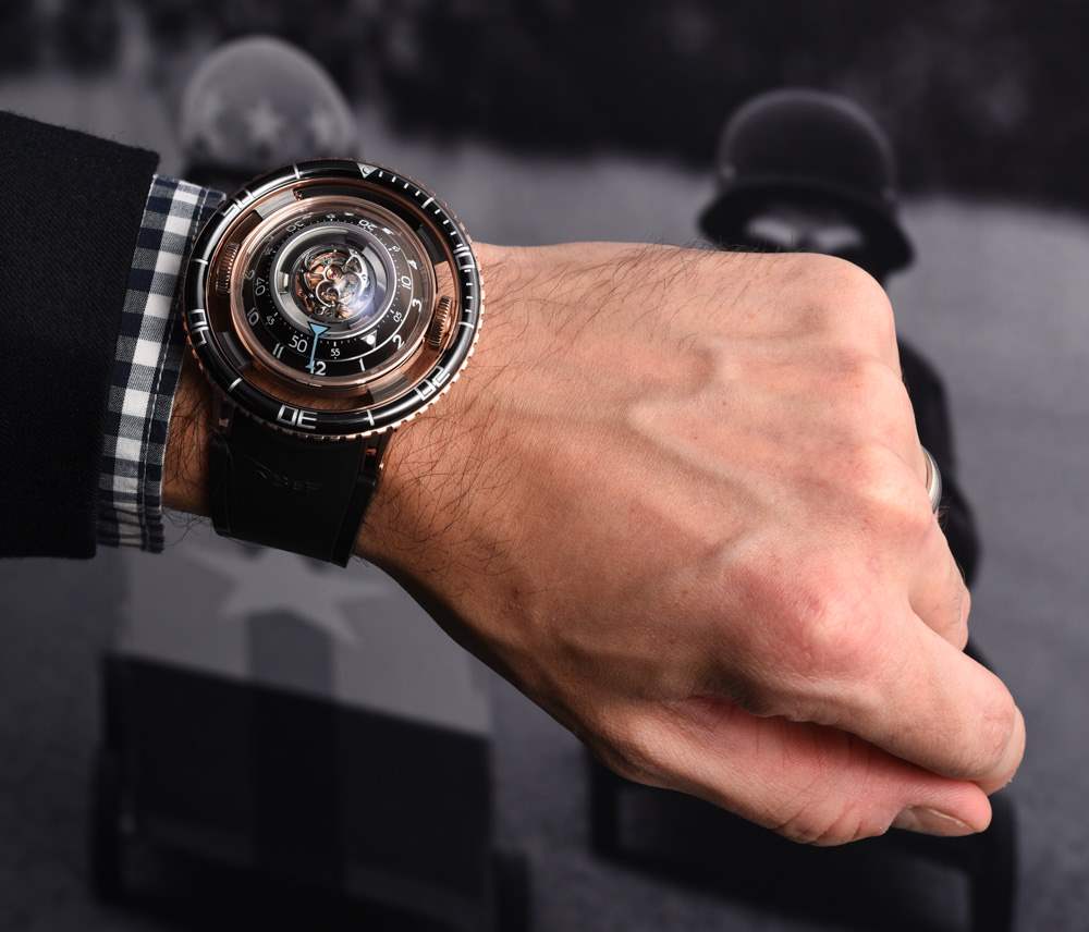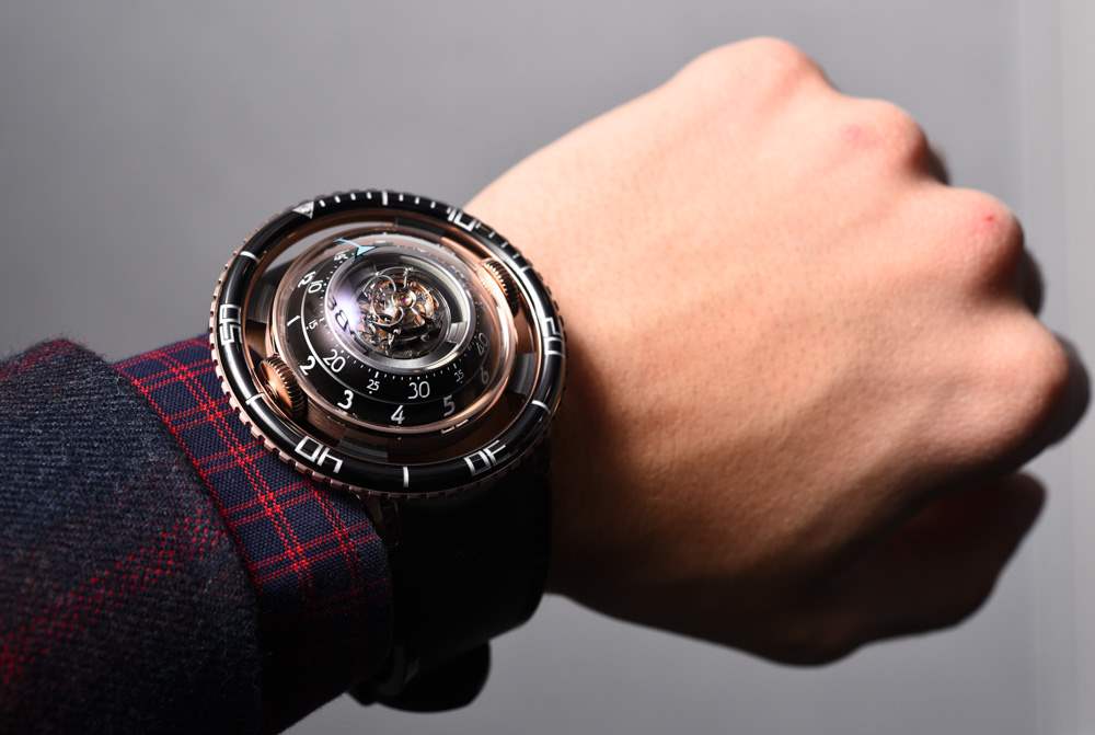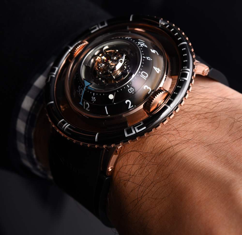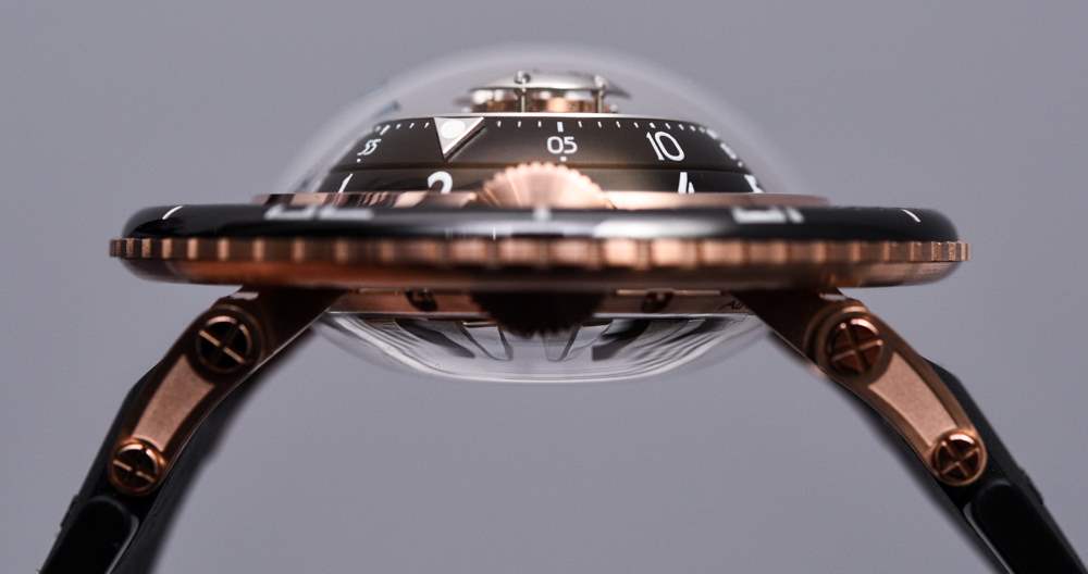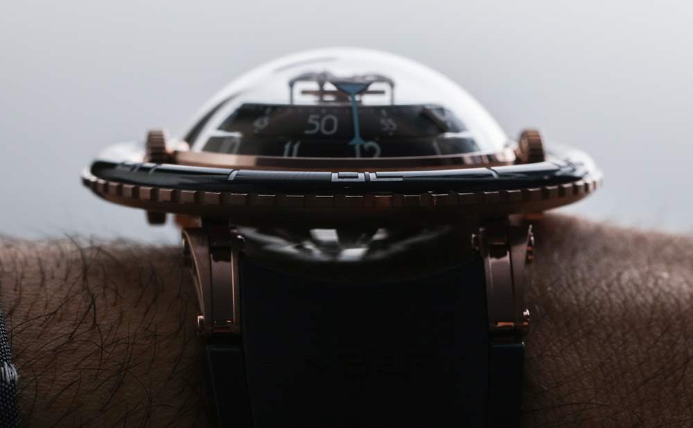 從側面看,MB&F HM7 Aquapod 看起來很像 1950 年代或 1960 年代的 UFO 概念,這直接體現了 MB&F 對科幻主題的持久熱愛與鐘表優雅相結合。盡管表殼相當大,寬 53.8 毫米,厚 21.3 毫米,但大部分重量實際上都位于您的手腕上方,因此非常舒適。此外,高端橡膠表帶非常舒適(而且看起來很整潔),并且可以舒適地佩戴在手腕上。在為 MB&F 之類的東西支付大筆費用時,您肯定知道自己在投資設計和人體工程學——認真。