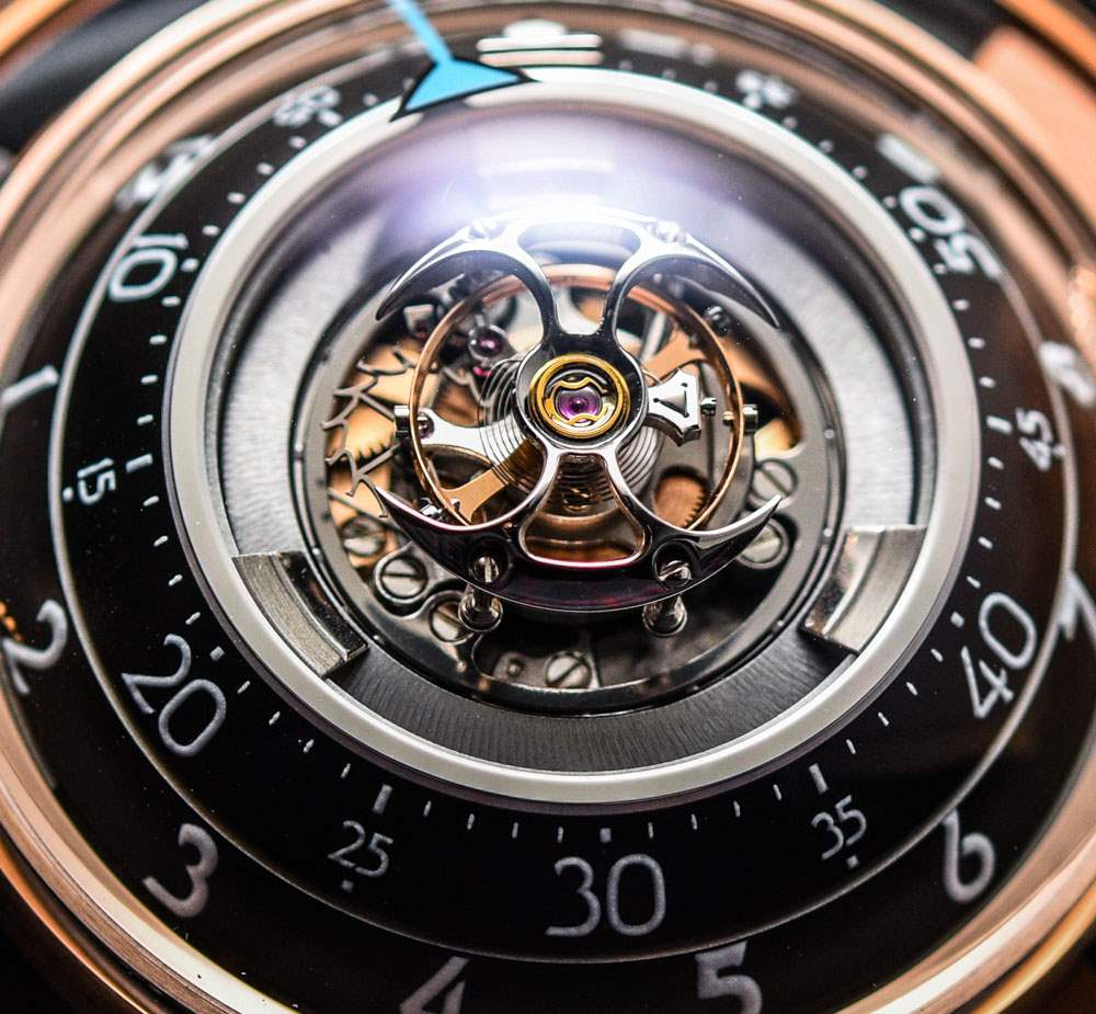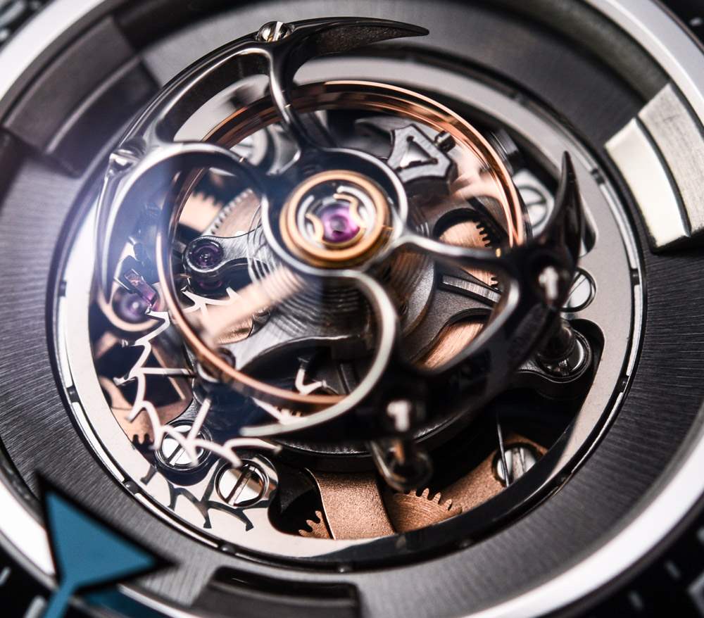 即使是旋轉表圈的動作也感覺很流暢,每次停止時都有可靠的咔噠聲。手表的這個元素感覺與其他元素一樣精心設計,我可以很容易地說,現在 MB&F 設計了一個旋轉表圈,他們做得非常好。在功能上,這款手表相當簡單,通過旋轉環提供小時和分鐘,陀飛輪框架或多或少兼作秒針。面向佩戴者的電藍色線是您讀取當前時間的位置。一旦你掌握了它的竅門,它實際上很容易閱讀。