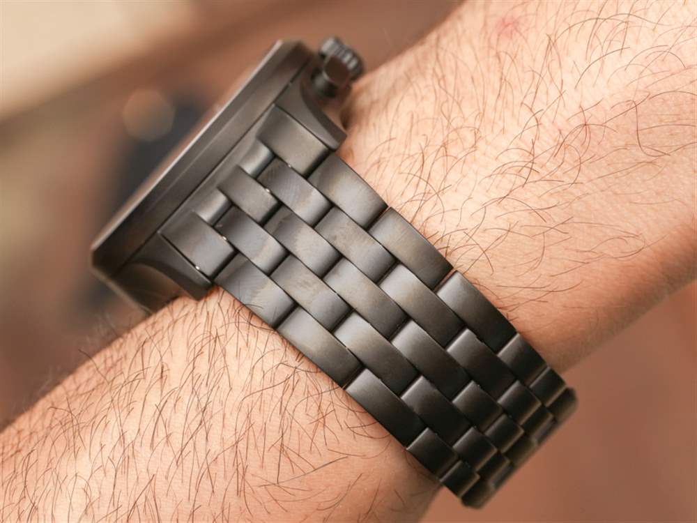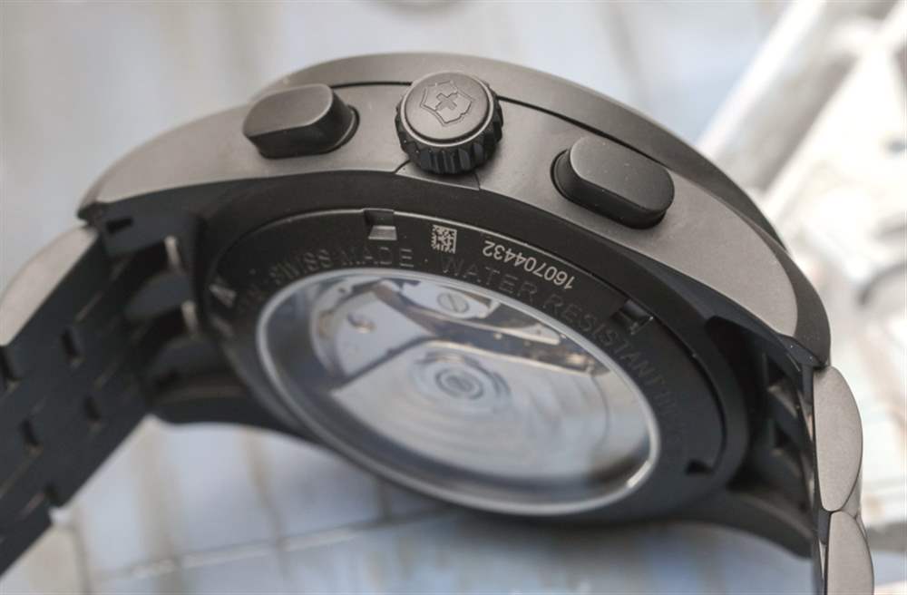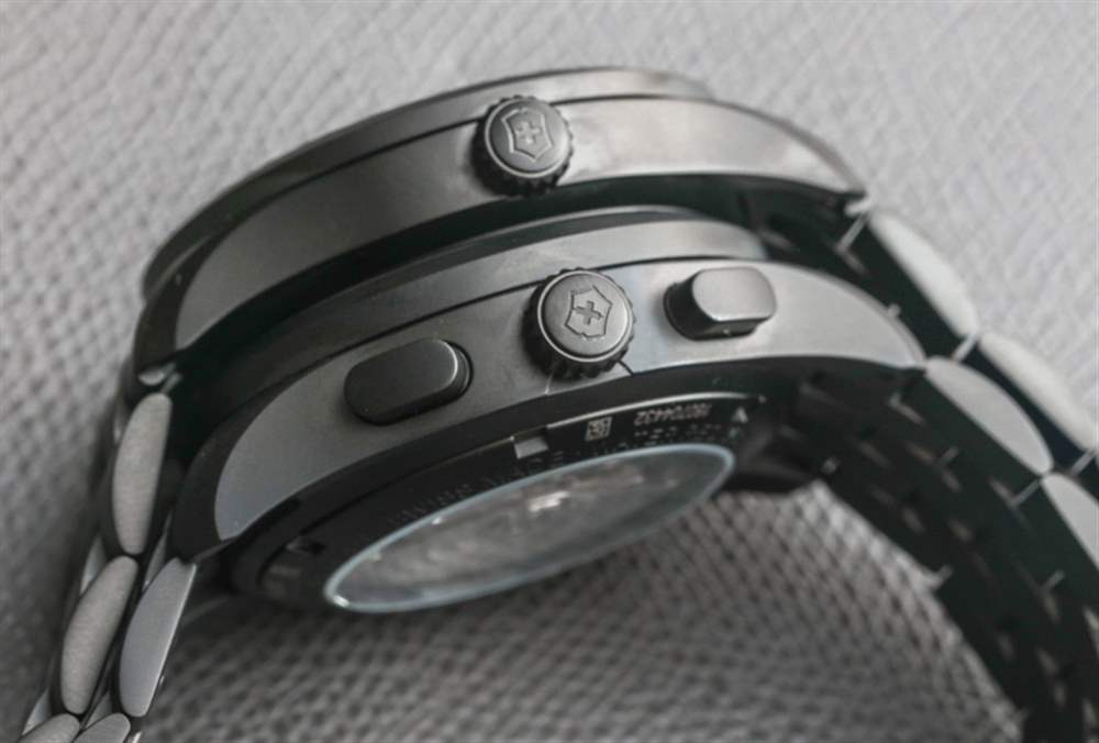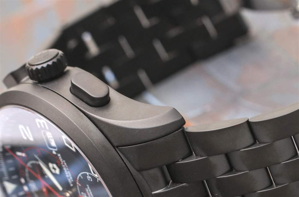 話雖如此,對于那些喜歡多功能但暗示熱愛齒輪、積極生活方式的人來說,軍用計時碼表是一種很難放棄的手表。與三針 Airboss Black Edition 相比,計時表殼的厚度可想而知約為 15 毫米,再加上 42 毫米寬的尺寸,可提供充足但不會過大的佩戴體驗。手鏈上的啞光黑色 PVD ??涂層精鋼表殼往往看起來很漂亮,這里也不例外。Victorinox Swiss Army 設計的表殼具有 100m 的良好防水性能,無需旋入式表冠即可實現。