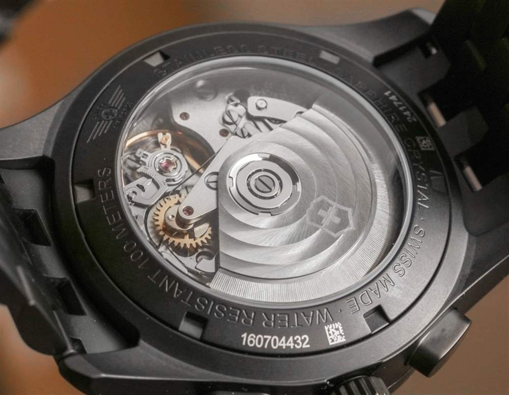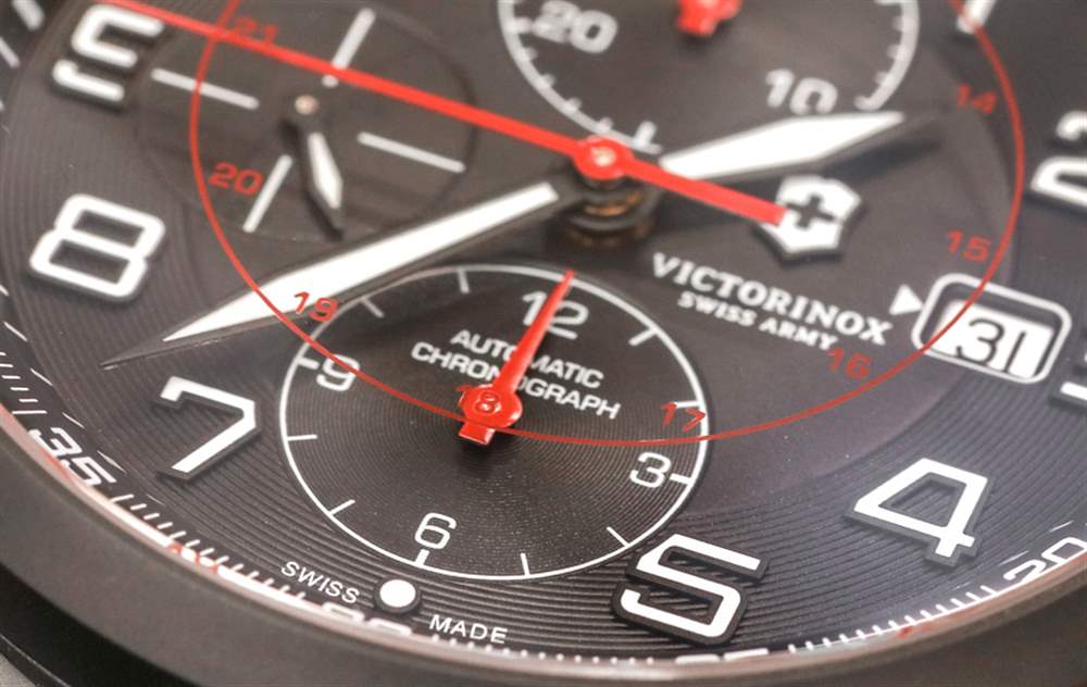 表殼背面是一個展示窗,可以看到機芯。表盤上方是平坦的 AR 涂層藍寶石水晶。Airboss Black Edition 系列設計的一個有趣特點是在藍寶石水晶底面放置了一個紅色軍用時間刻度。表盤上有標準時間和軍用時間是許多 Victorinox 瑞士軍表的標志,因此這只是一種創造性嘗試。我知道在圖像中很多人擔心這個元素會分散注意力,但我認為這是一個受歡迎的設計元素。