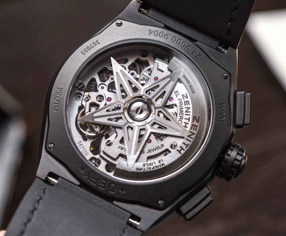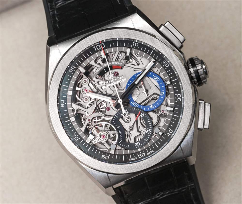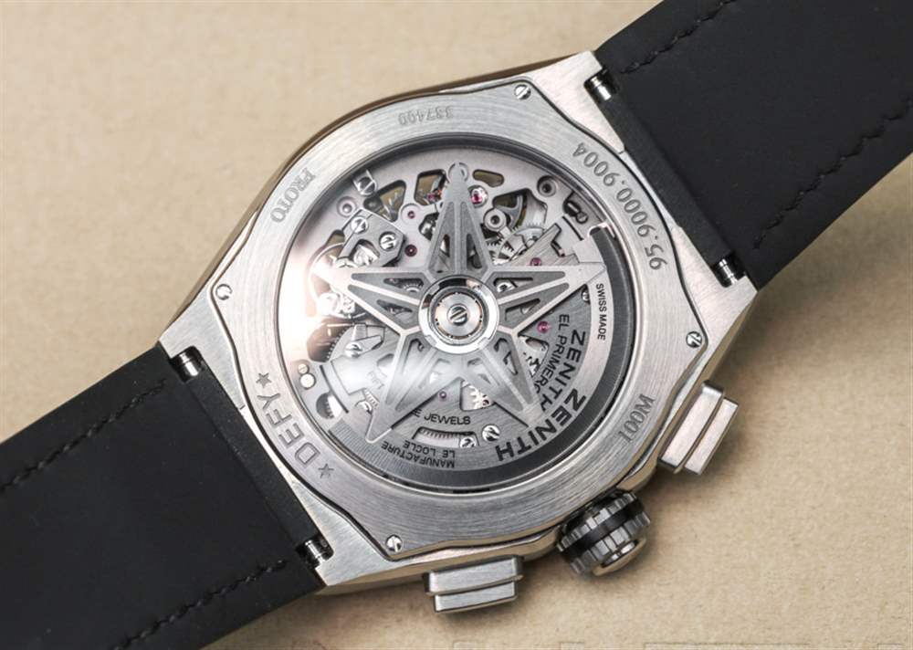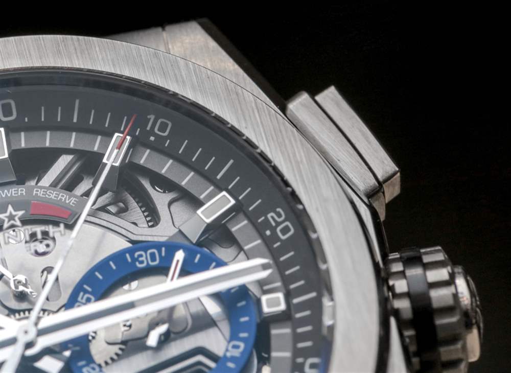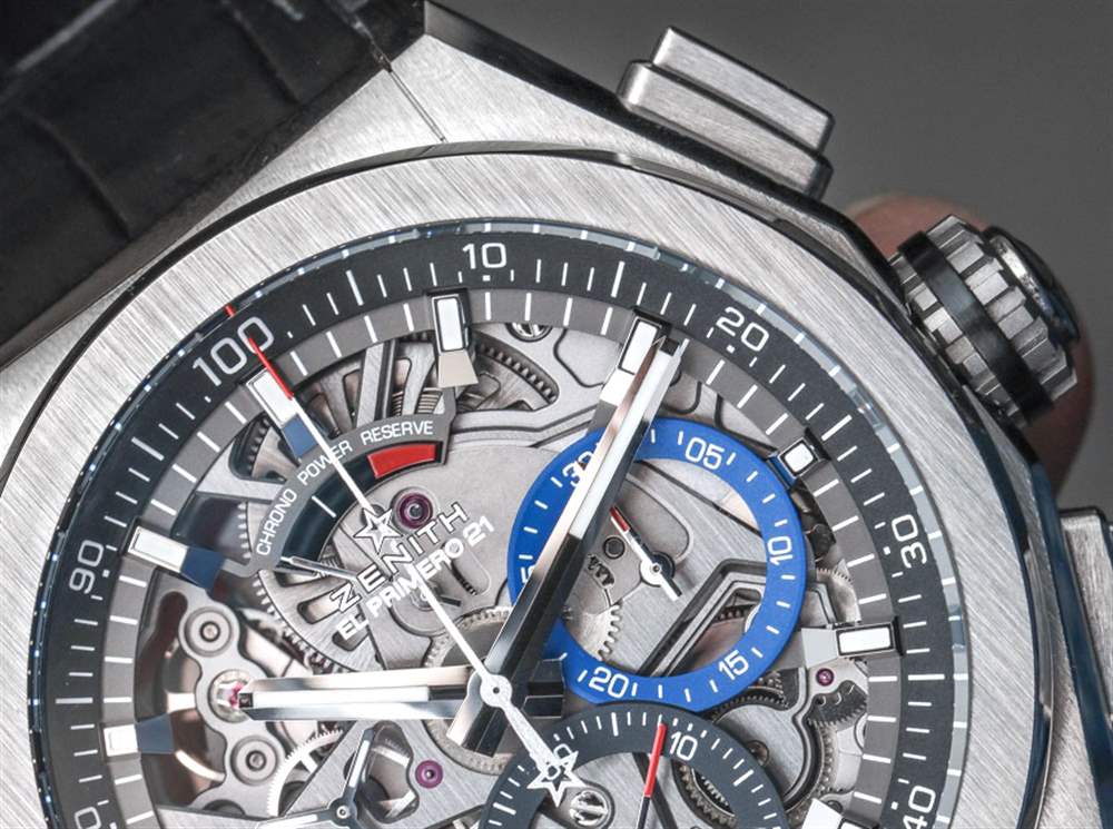 當我推出 Zenith Defy El Primero 21 時,我解釋說 Zenith 將首先發布三個版本。我不認為我會像開放式表盤那樣喜歡實心表盤版本……但我確實喜歡。44 毫米寬的鈦金屬或黑色陶瓷(不要與圓形尺寸混淆!)鋁制表殼既舒適又美觀。表殼厚度為 14.5 毫米,防水深度達 100 米,采用平坦的 AR 涂層藍寶石水晶鏡面)。它可能沒有宇舶大爆炸那樣的直接吸引力,但話又說回來,它并沒有試圖成為一個。事實上,這款表殼在手腕上看起來非常優雅,最突出的特點是略顯不成比例的大矩形計時碼表按鈕——考慮到這款手表完全是關于計時碼表的,這可能是一個有目的的設計決定。