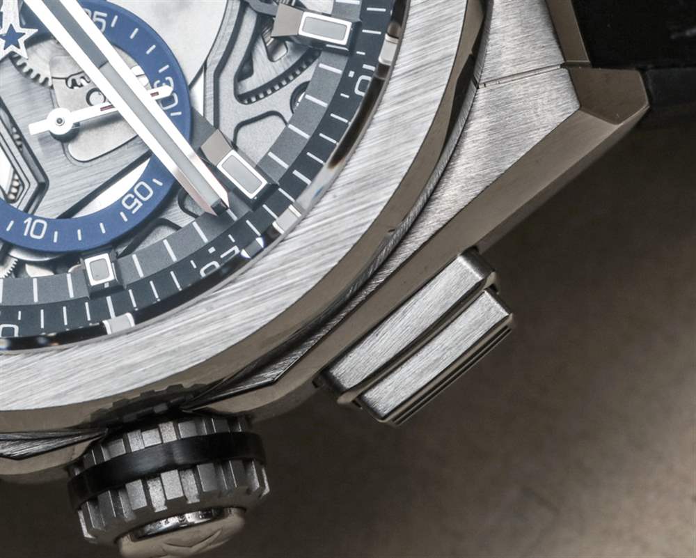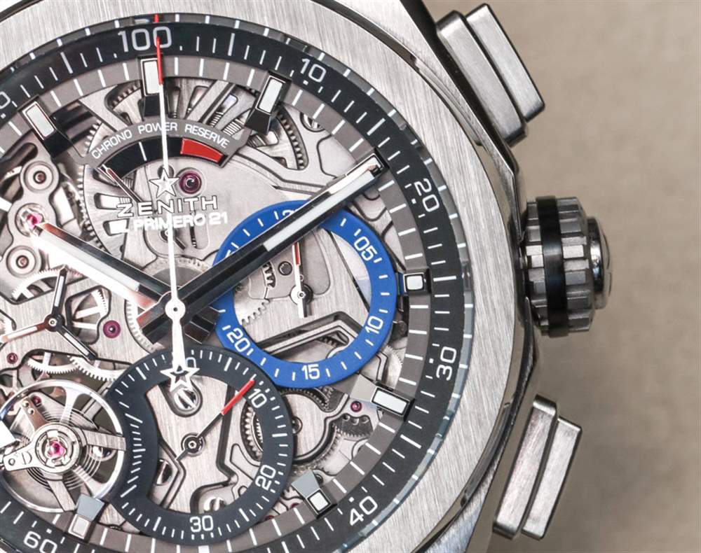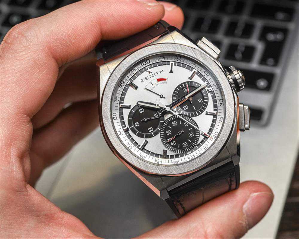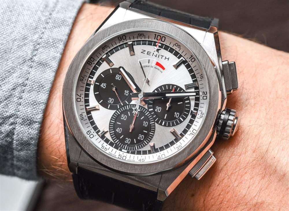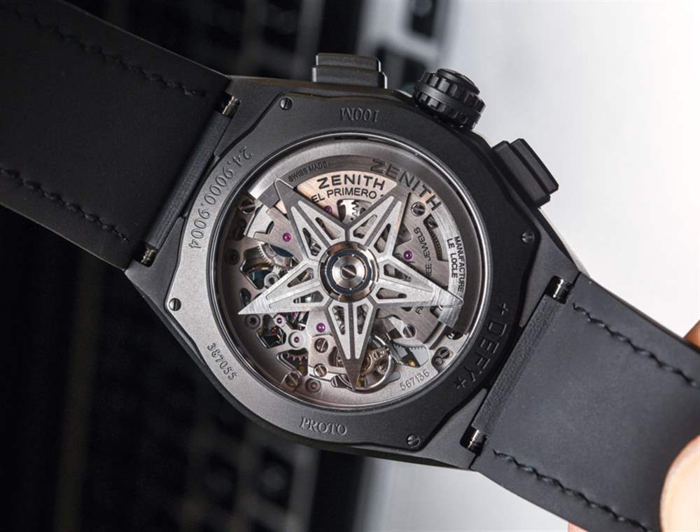 當我推出 Zenith Defy El Primero 21 時,我解釋說 Zenith 將首先發布三個版本。我不認為我會像開放式表盤那樣喜歡實心表盤版本……但我確實喜歡。44 毫米寬的鈦金屬或黑色陶瓷(不要與圓形尺寸混淆!)鋁制表殼既舒適又美觀。表殼厚度為 14.5 毫米,防水深度達 100 米,采用平坦的 AR 涂層藍寶石水晶鏡面)。它可能沒有宇舶大爆炸那樣的直接吸引力,但話又說回來,它并沒有試圖成為一個。事實上,這款表殼在手腕上看起來非常優雅,最突出的特點是略顯不成比例的大矩形計時碼表按鈕——考慮到這款手表完全是關于計時碼表的,這可能是一個有目的的設計決定。