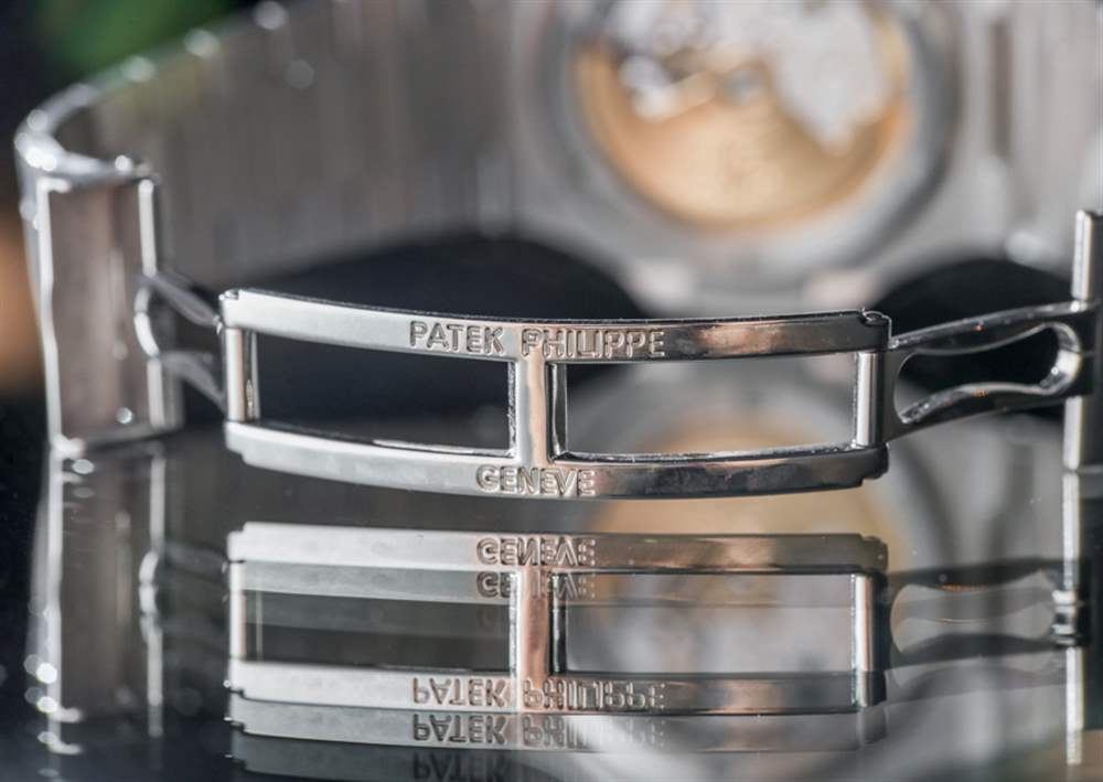 添加長方形鉆石作為時標似乎適合這種類型的手表。純粹主義者會聲稱他們不必要地添加了金光閃閃,并從 Genta 為百達翡麗鸚鵡螺設計的最簡單的表盤上拿走了。也許這在精鋼表款上是正確的,但對于這款價值 100,000 美元以上的限量版鉑金表款,您不妨在組合中添加鉆石時標。它只是讓佩戴者整體感覺更好,手表似乎旨在傳達情感。另一顆鉆石放置在表殼下方 6 點鐘方向下方,面向用戶。廣告訊息廣告信息結束