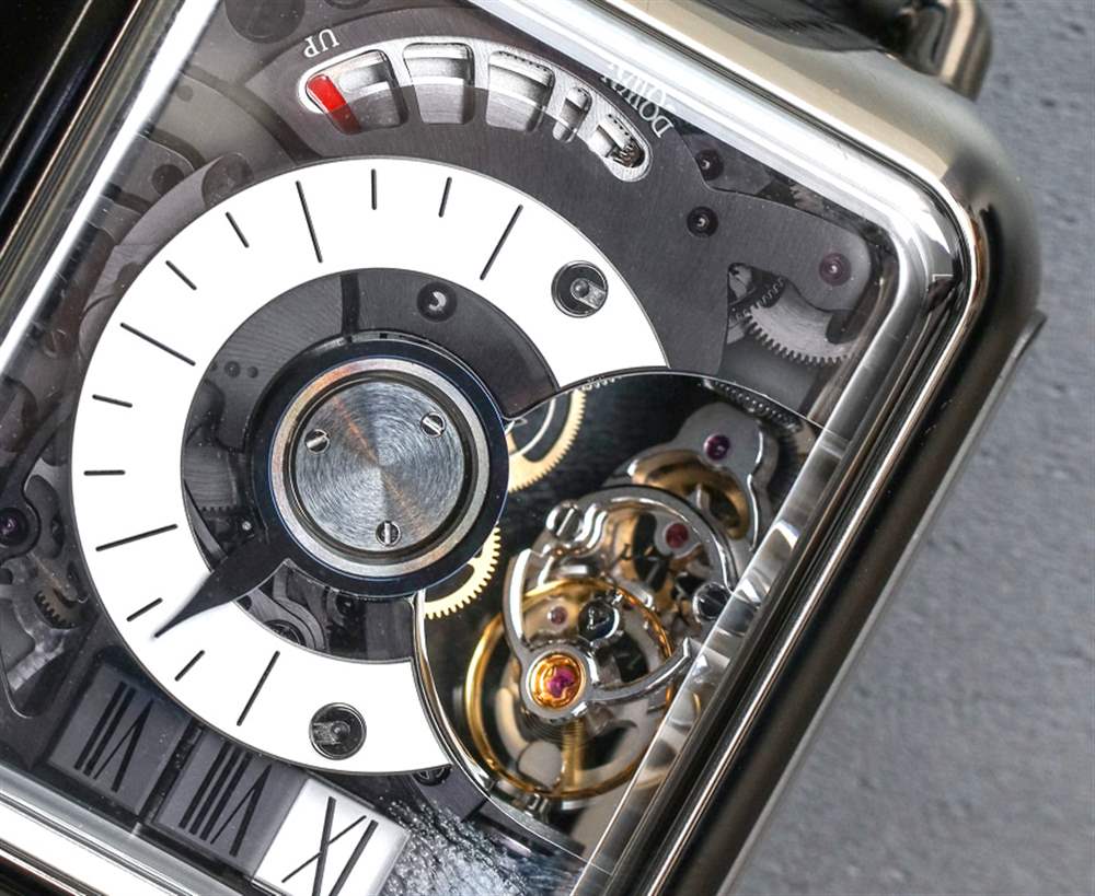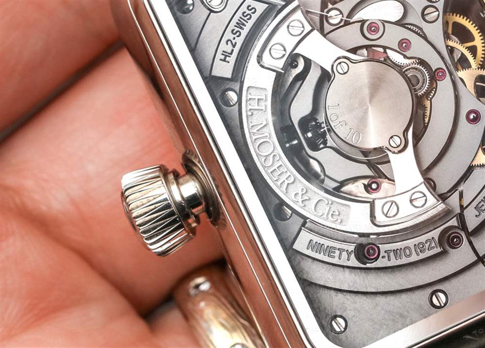 該機芯是帶有微型轉子的自動機芯,其中一個發條盒專門用于為時標鏈帶的復雜運動提供動力。機芯運作的真正美妙之處在于,每經過一小時,時標帶會緩慢移動幾秒鐘。這是一件很酷的事情。HL2.0 機芯還有一個分鐘逆跳指示器,在 H. Moser & Cie Swiss Alp Watch Minute Retrograde 時計上,該指針與白色大明火琺瑯表盤(采用傳統設計的藍鋼指針)相對。機芯底部是一個方便的動力儲存指示表盤——我一直很欣賞。