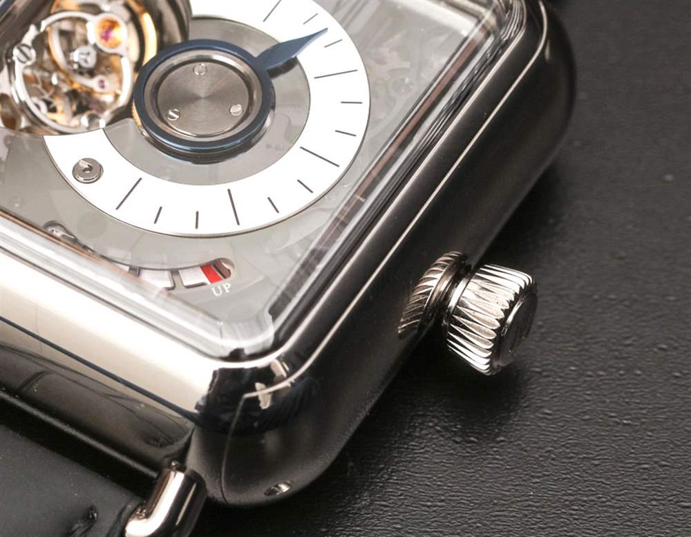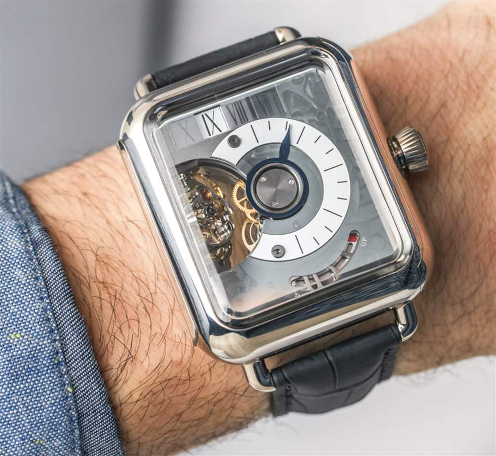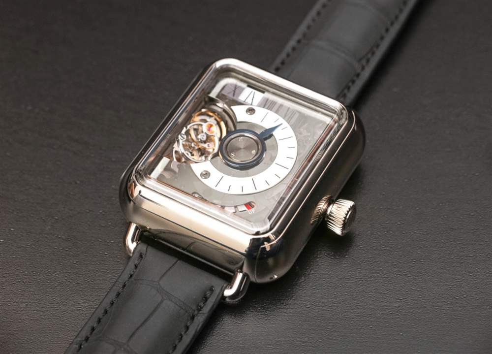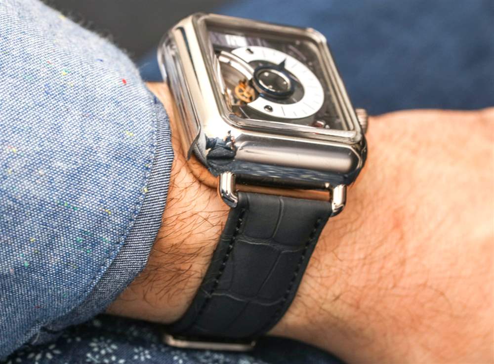 H. Moser & Cie Swiss Alp Watch Minute Retrograde 這款限量版的表殼采用 18k 白金制成,尺寸為 42.1 毫米寬、18.3 毫米厚和 48 毫米長。它絕不是謹慎的,它像一小塊肥皂(帶凸耳)一樣戴在手腕上的鱷魚皮表帶上。這本質上是 H. Moser & Cie 生產的表殼的膨脹版本,看起來就像 Apple Watch,但里面有一個機械機芯。