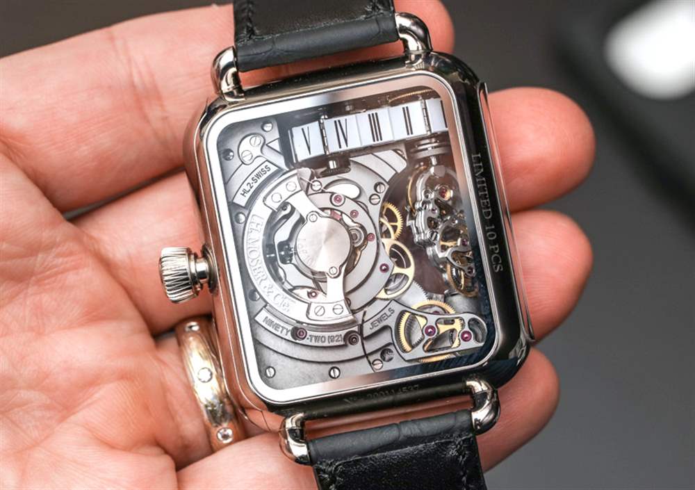 口徑 HL2.0 機芯有許多有趣的話題,從它自己的“陀飛輪”風格開始。擺輪調節系統是一個長的垂直組件,隨著用于指示跳躍時間的胎面的運動而轉動。您需要親自查看才能真正理解它,但在表殼頂部附近有一個小窗口,用于顯示小時(此處為羅馬數字),在每個小時結束時以一小時為單位移動。隨著每一小時的流逝,建立調節系統的柱子會旋轉一點,看到實際情況真的很有趣。擒縱系統的工作頻率為 18,000 次/小時(3 赫茲),機芯配備兩個主發條盒,動力儲存為 45 小時。