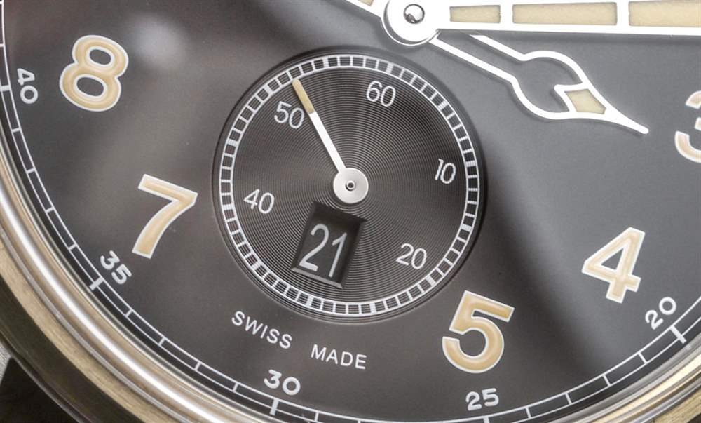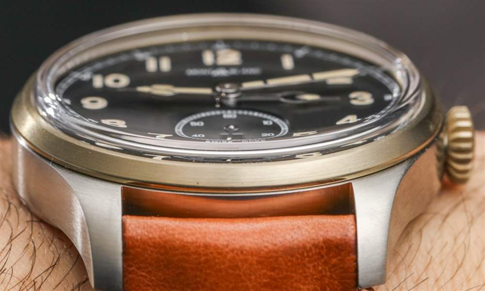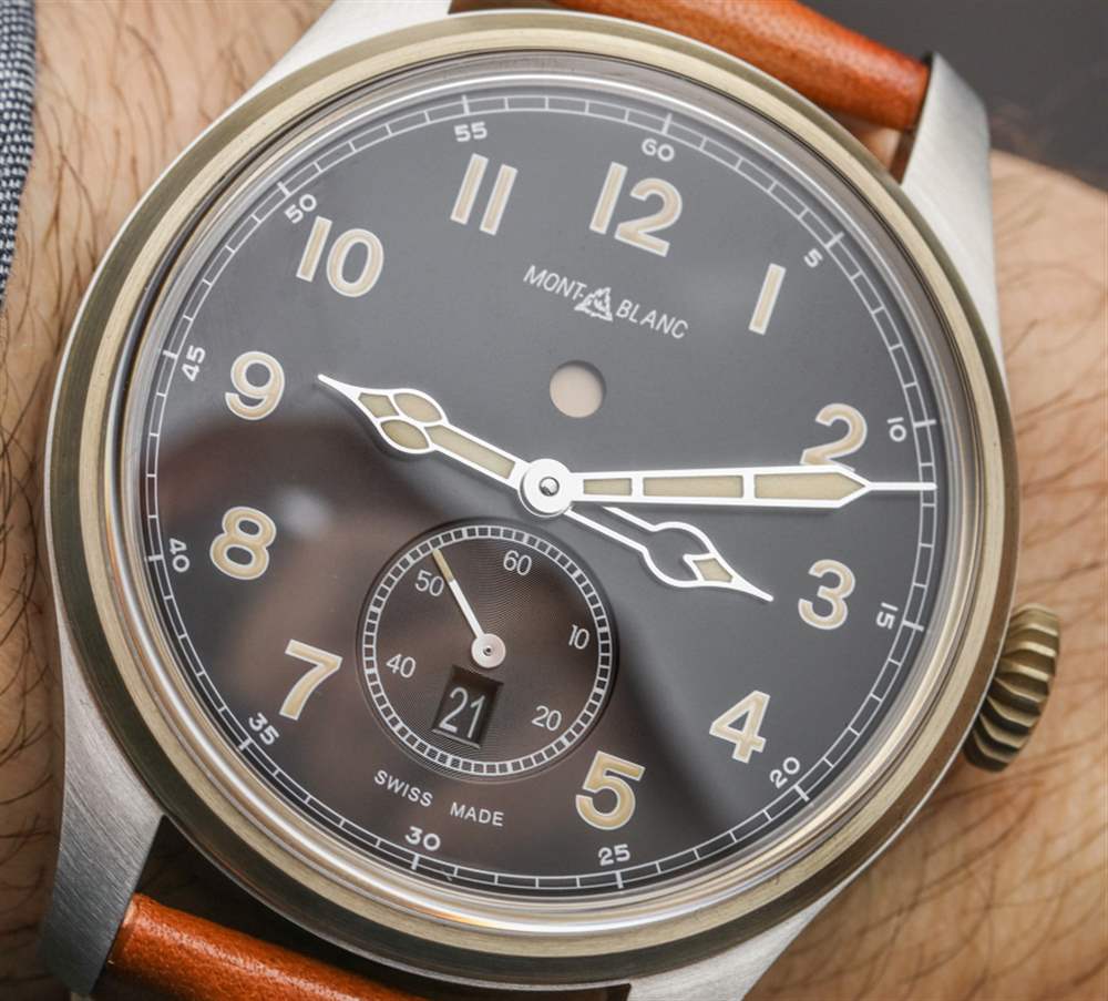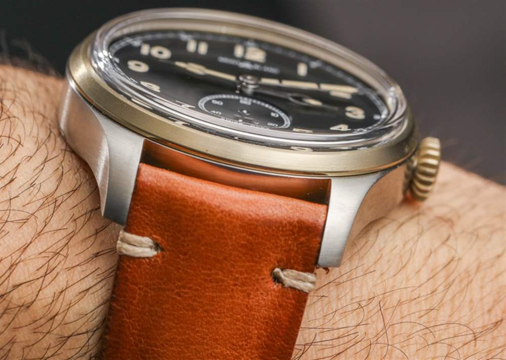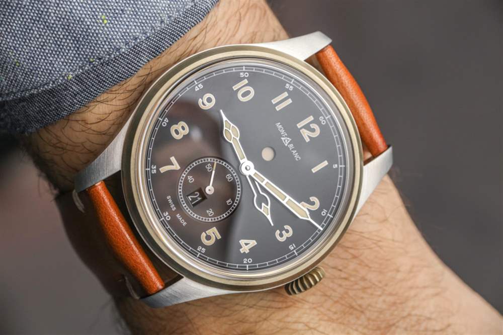 戴在手腕上的萬寶龍 1858 自動雙時腕表的尺寸為 44 毫米寬和 12.3 毫米厚(防水深度僅為 30 米)。主表殼為拉絲鋼,而表圈和表冠為青銅——這種材料會隨著時間的推移而產生古銅色。青銅在過去幾年一直是一種時尚材料,它與指針和時標上的發光體的陳舊外觀相匹配,它在這樣的手表中的整合非常巧妙。萬寶龍將這款腕表與舒適的“適合時代”、“陳年小牛皮”表帶搭配,采用迷人的干邑色。