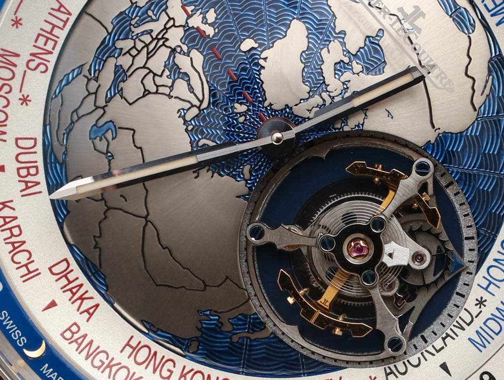 Jaeger-LeCoultre 聲稱在世界時間顯示盤中心的“地球表盤”上使用了扭索飾式機器雕刻來呈現海洋的外觀。它不是一個特別有用的表盤中心,但它在視覺上很有吸引力,這正是一些人認為的地球物理學,好吧,地球物理學。與此相同的其他 Geophysic 手表系列主題包括應用在表盤外圍的小發光點。