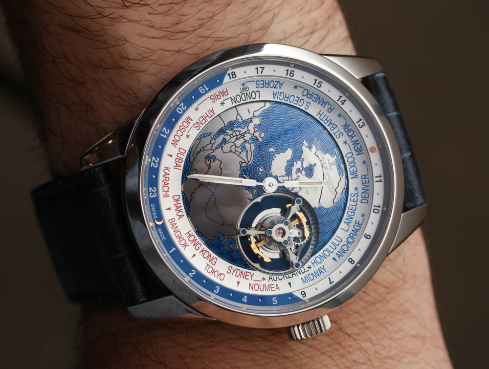 Jaeger-LeCoultre 地球物理世界時陀飛輪腕表在圖像上看起來很整潔,但您需要看到這款腕表在運行中才能欣賞它。首先是 43.5 毫米寬的豪華實心鉑金表殼。它戴在手腕上很舒適,而且明顯比 Geophysic 系列的其他產品更引人注目——尤其是三手型號。當然,Jaeger-LeCoultre 地球物理世界時陀飛輪建立在標準地球物理世界時(此處動手實踐)之上,這是一個以手表書呆子為主題的自制自動機芯與“真秒”滴答作響的巧妙組合秒針和世界時間指示器。廣告訊息廣告信息結束