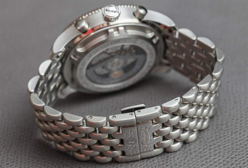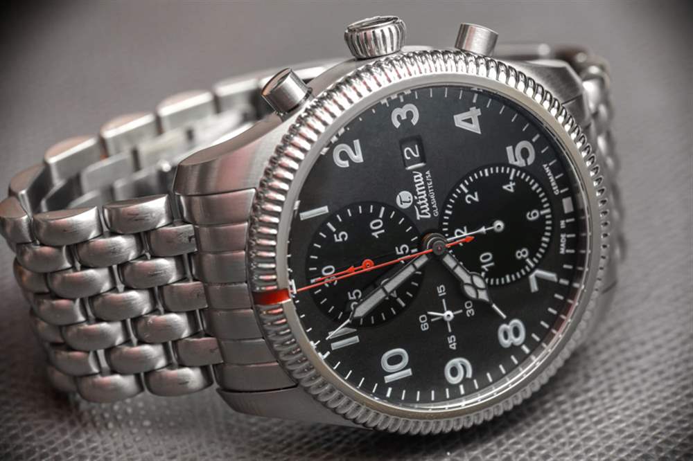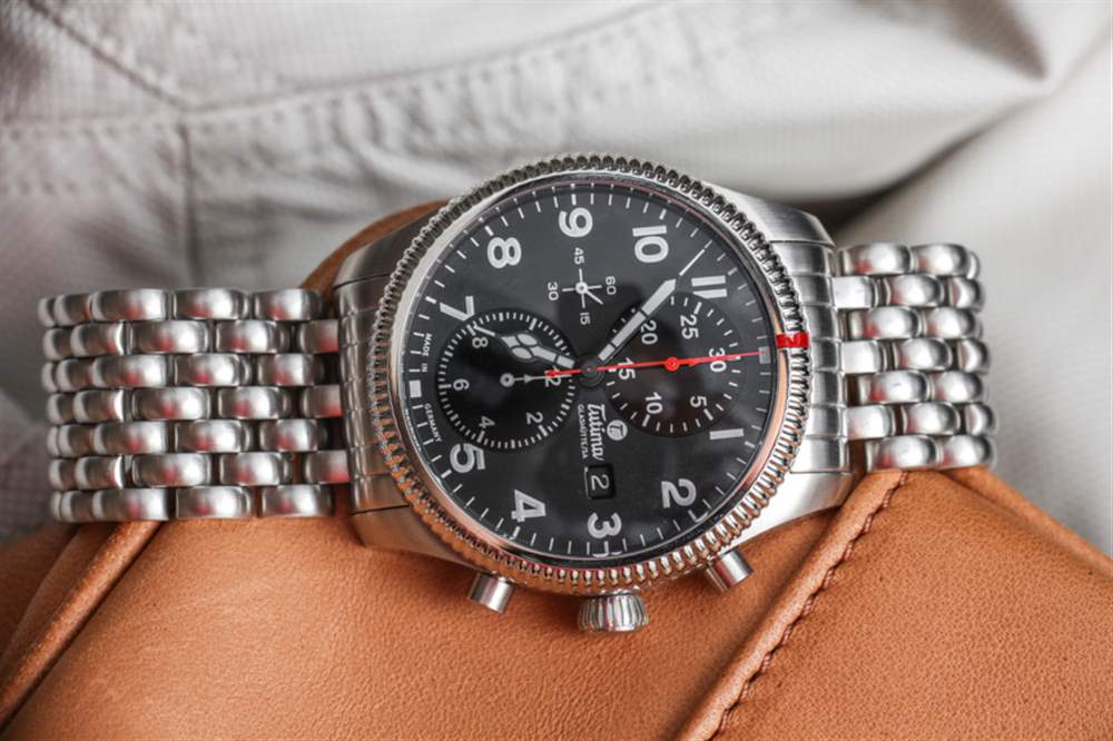 Tutima Grand Flieger Classic Chronograph 戴在手腕上非常舒適,表殼制作精良。鋼制表殼寬 43 毫米,厚 16 毫米,經久耐用,防水深度達 200 米(表冠螺絲擰入)。表盤上方是圓頂 AR 涂層藍寶石水晶鏡面,表殼背面是展示底蓋窗口。考慮到表耳的厚度以及突出的表耳間距以容納漂亮的寬表帶或手鏈,表殼的厚度略大于 43 毫米。大部分表殼都經過拉絲處理,表面處理非常出色,與您對這個價格的現代德國鋼制工具表的期望相當。