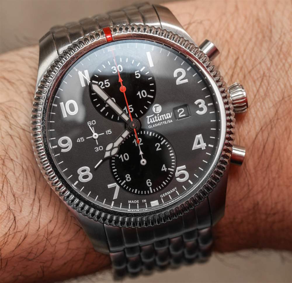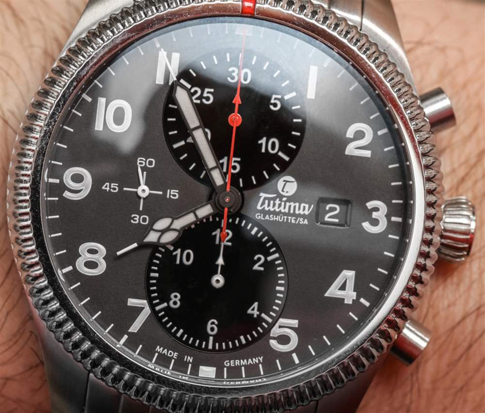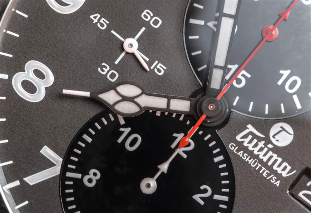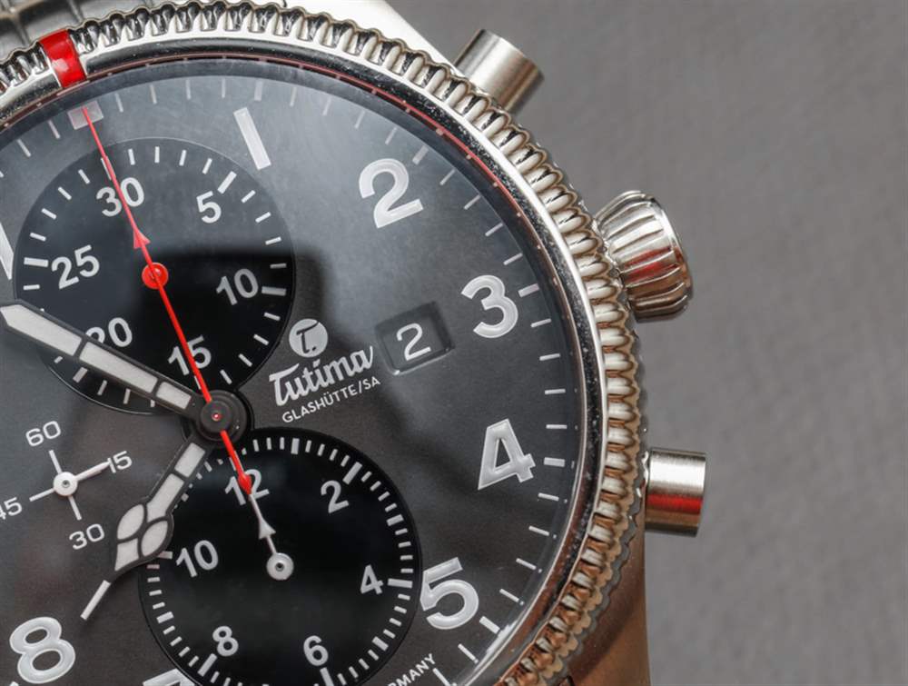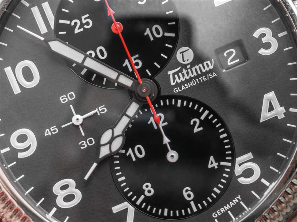 紅色的強調色也是一個重要的風格提示,謝天謝地,這種顏色的使用相當謹慎。計時碼表秒針和分針表盤使用紅色,但計時碼表時針不使用紅色。我相信這是有充分理由的,但通常在顏色編碼指針方面,時間指針是一種顏色,而計時指針是另一種顏色。因此,雖然 Tutima 渲染 Tutima Grand Flieger Classic Chronograph 表盤的方式在美學上看起來更好,但我的強迫癥告訴我計時碼表時針也應該是紅色的。