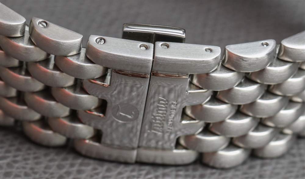 紅色進一步用于雙向旋轉硬幣邊緣表圈上的“0標記”。Tutima 延續了制作這種有點過時風格的旋轉表圈的傳統。我說的是陳舊的,因為它們只有一個參考點(紅色標記),因此理論上不如旋轉表圈有用,例如,具有更多標記的潛水式手表。擋板具有令人愉悅的流暢操作。我不認為很多人會使用它,但它是一個很好的附加功能。