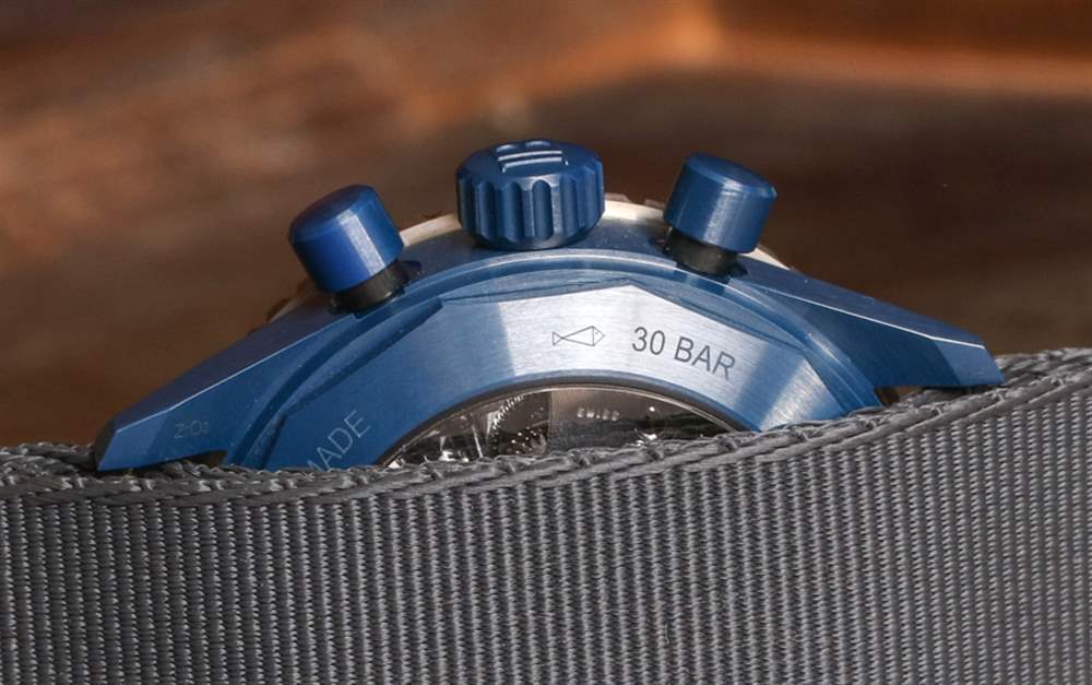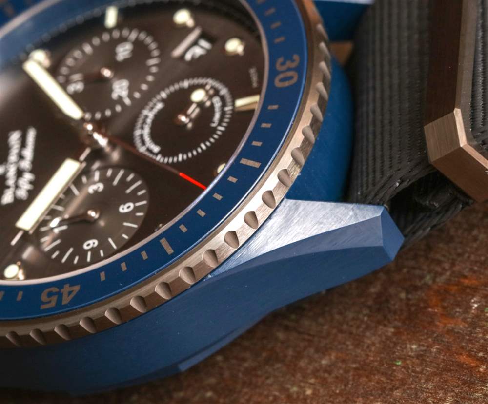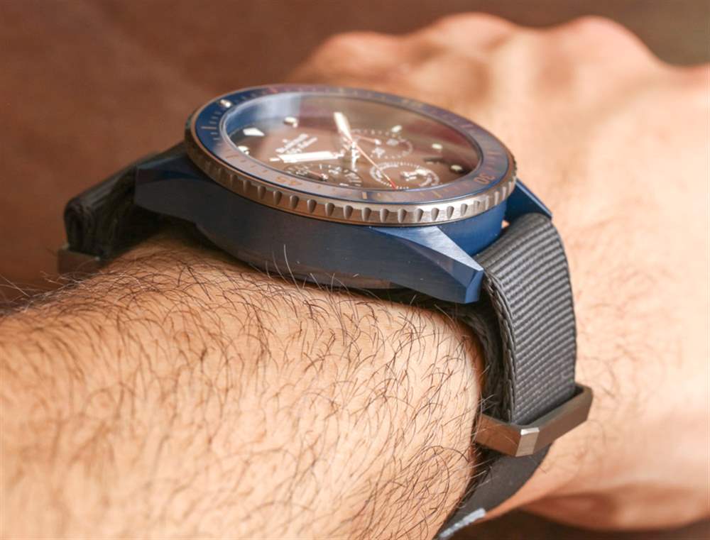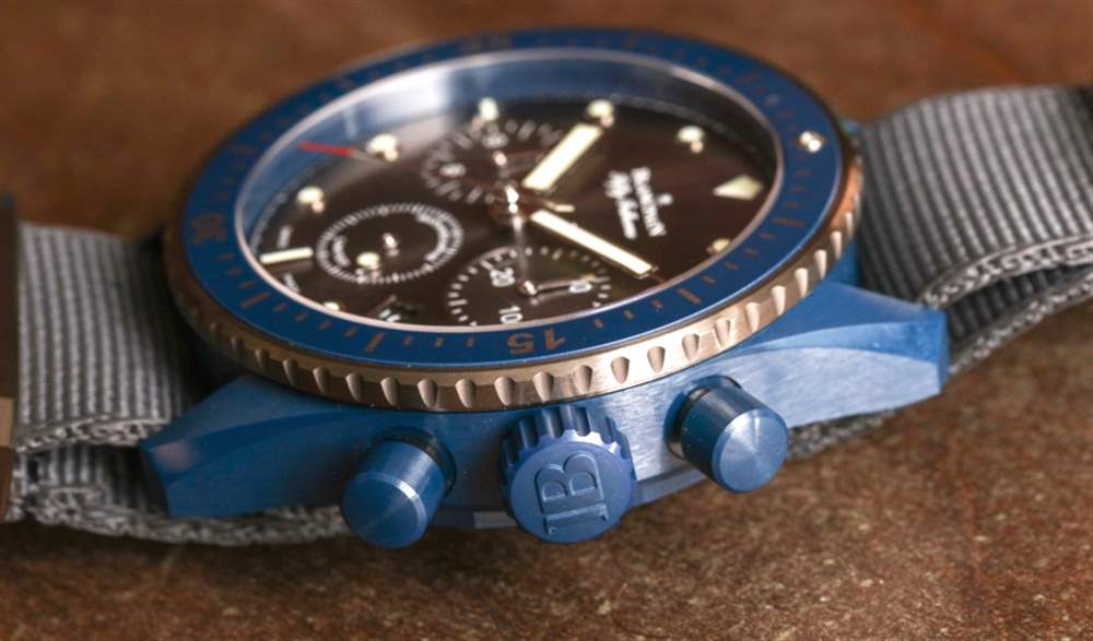 表盤周圍是平穩操作的 120 次點擊、單向旋轉潛水員式表圈。外圈是鈦,液態金屬(與歐米茄共享的另一種技術)和藍色陶瓷作為表圈的其余部分。表冠和按鈕也采用藍色陶瓷制成——同樣精美。