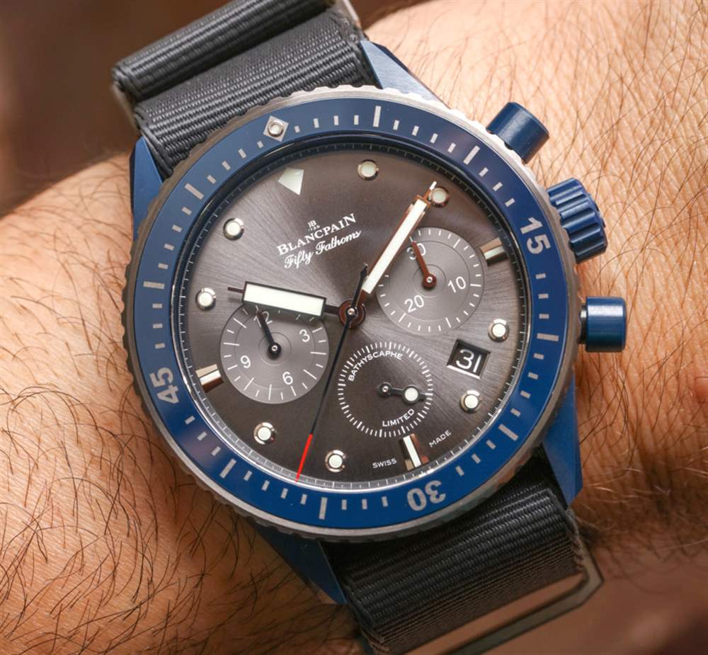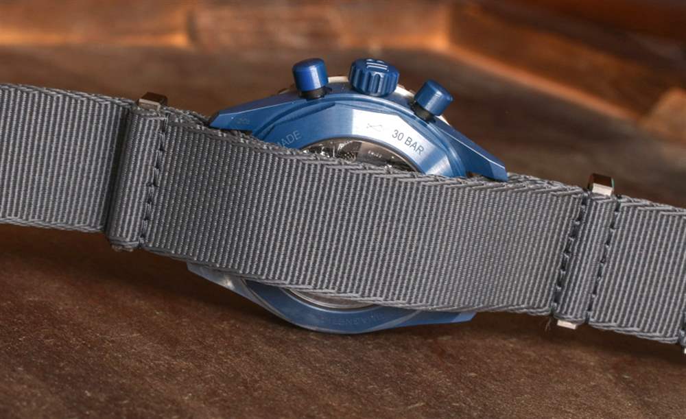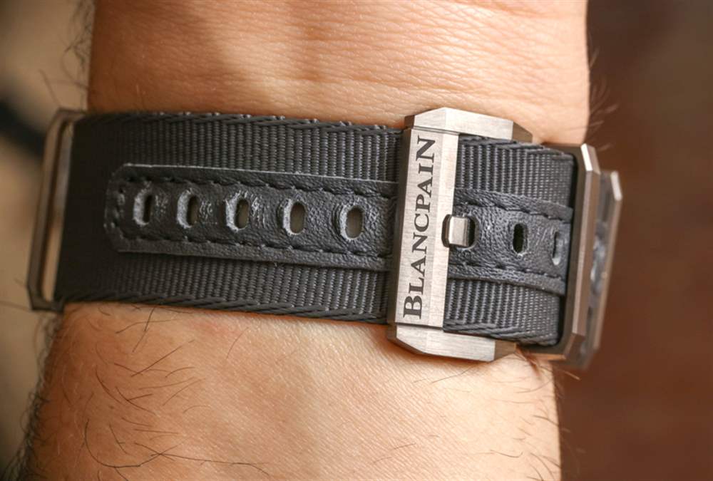 該品牌提供兩個版本的寶珀五十噚深潛器 Flyback Chronograph Ocean Commitment II,無論是灰色紡織/帆布表帶,還是這款帶有灰色鈦金屬硬件的高端 NATO 風格表帶。這是一條非常漂亮的 NATO 風格表帶,但它確實有 23 毫米寬的尺寸,而且在如此高端的手表上也感覺有點奇怪(即使它看起來很酷)。