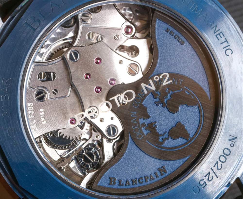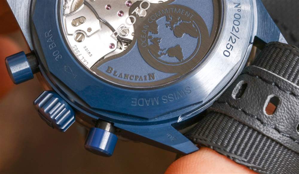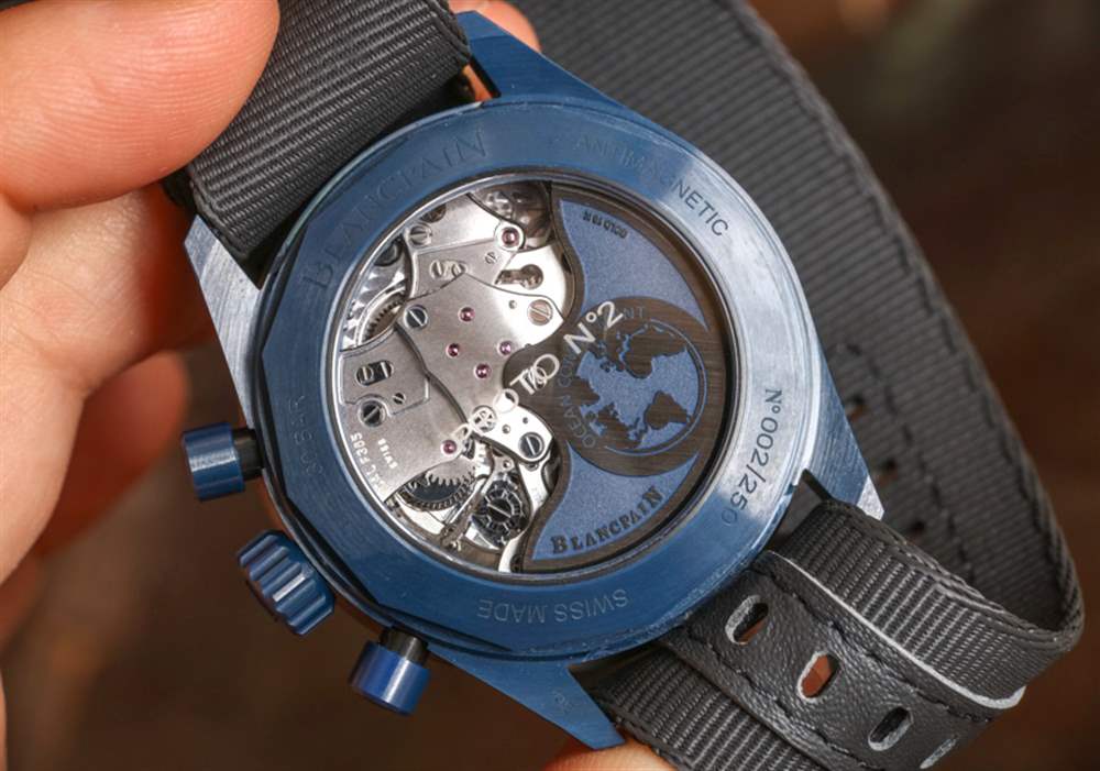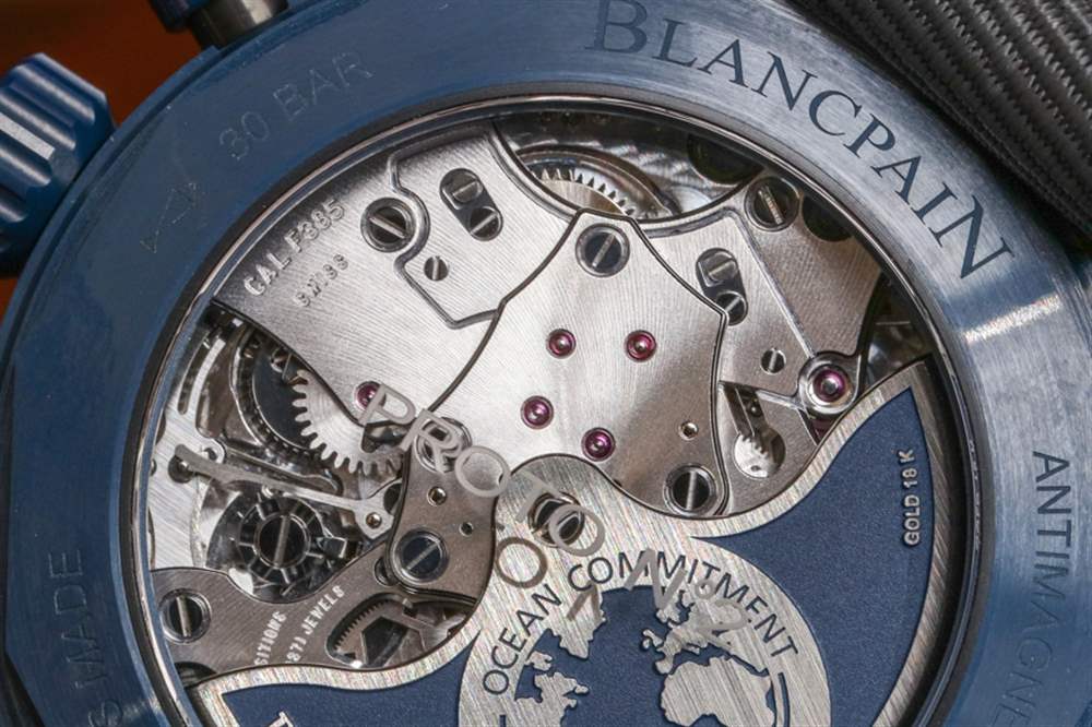 除了美學之外,一個很好的理由是寶珀五十噚深空飛返計時碼表內部的機芯,這是內部制造的寶珀口徑 F385 自動計時碼表。透過表殼背面可以看到機芯,不難看出它的設計和裝飾都很可愛。現代的線條和形狀裝飾著這款現代機械機芯,它也恰好擁有 5Hz (36,000bph) 的工作頻率。這與著名的 Zenith El Primero 相同,比大多數標準 4Hz 計時手表快 1Hz。
