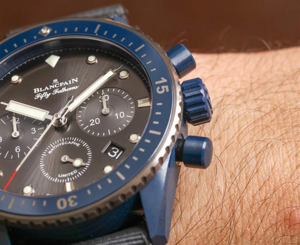 第一款五十噚深海飛返計時海洋承諾腕表采用灰色陶瓷表殼,搭配藍色表圈和表盤。寶珀五十噚深海飛返計時碼表 Ocean Commitment II 采用藍色陶瓷表殼和表圈,然后是金屬灰色表盤,有點顛倒了這個調色板。第一款和第二款 Ocean Commitment 都非常棒,但陶瓷手表愛好者顯然會涌向這款續集限量版。