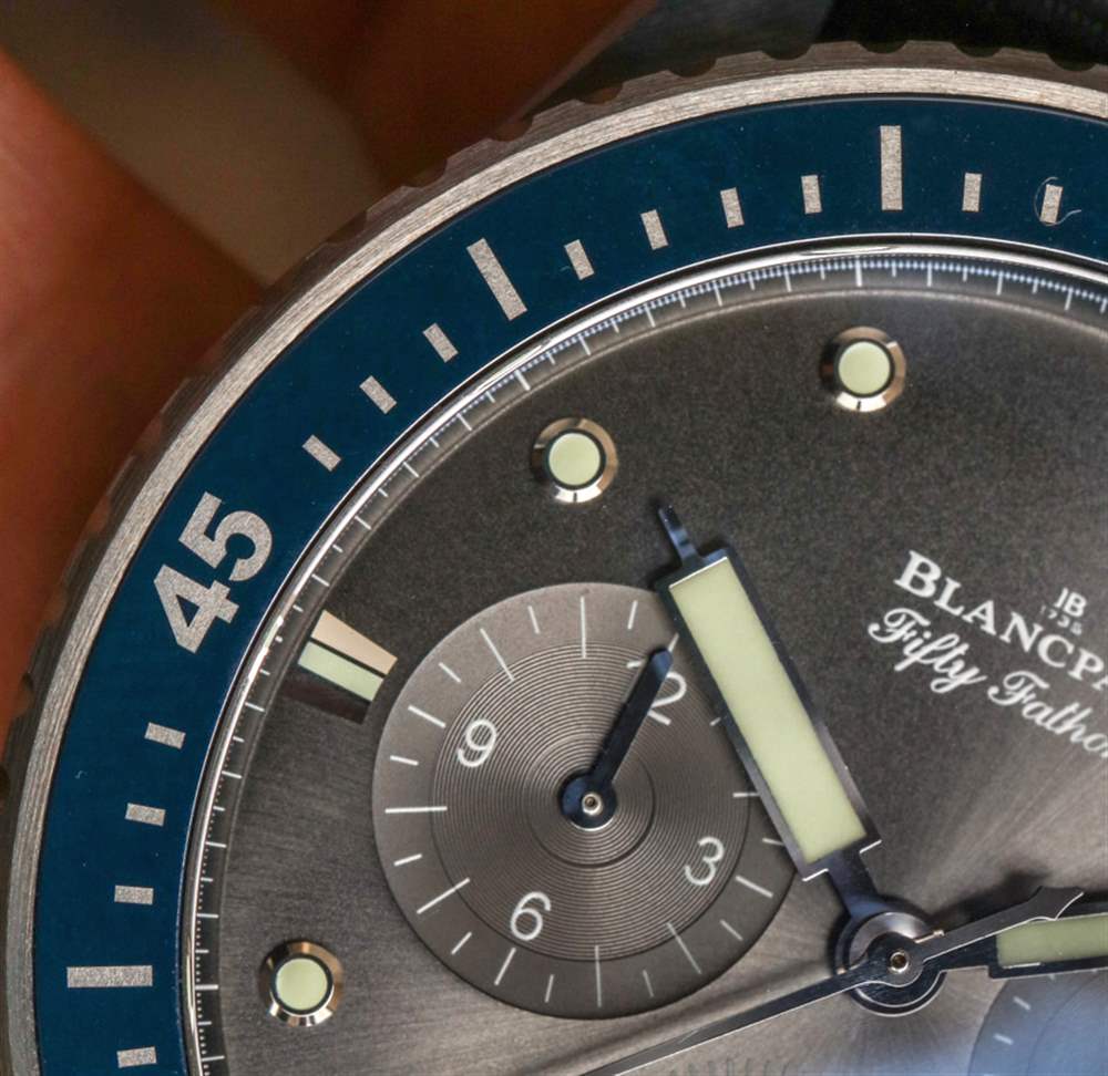也許表盤上唯一有爭議的元素是日期窗口。它確實有助于手表的銷售具有日期復雜功能。寶珀沒有將日期窗口設計為表盤,這也很好。然而,日期窗口是傾斜的,所以它的位置在 4 點到 5 點之間讀取有點奇怪。此外,日期盤本身是黑色的,比手表本身的“流星灰”表盤顏色要深一些。這真的沒什么大不了的,但這將是人們在其他漂亮的表盤設計中可能會抱怨的一件事。只需看一下表盤,您就會注意到表盤上的其他精彩細節。首先檢查小表盤的巧妙設計,以及大部分拋光的金屬框架時標。
