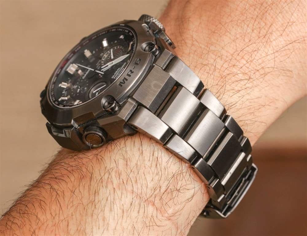 卡西歐再次能夠制造出佩戴舒適的超大手表。由于表殼、表耳和表鏈結構采用鈦金屬制成,我可以輕松地說,佩戴卡西歐 G-Shock MR-G MRGG1000B 時,您會忘記它就在手腕上。表殼寬 49.8 毫米,厚 16.9 毫米,從表耳到表耳的“高”為 54.7 毫米。然而它穿著非常明智。手鏈帶有全鏈節和半鏈節,三個微調銷棒固定在鎖定展開式表扣中,還具有一個很酷的滑動開關鎖。