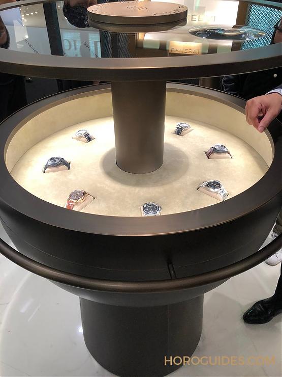 沛納海在全球有73間專賣店,除了臺北101專賣店與臺北微風專賣店,而另一間便是座落在臺中大遠百,這也是臺灣唯一一間在臺北以外的專賣店。一走進臺中專賣店內可以感受到店內寬敞而明亮的空間設計,店內特別程設了一座旋轉展示柜,內部陳列著沛納海相當熱門的Luminor 1950系列表款,而這個獨特展示柜以黃銅打造,外觀宛如床艙內的舵,在展示臺上設有獨特放大鏡,能夠讓賞表者進一步細看表款。