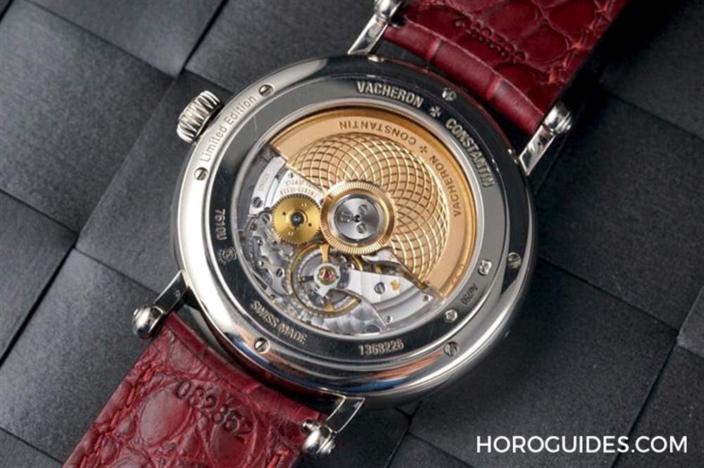 表款搭載2460 G4/1自動上鏈機芯,表盤上沒有指針,而是在四角各有小時、分鐘、日期以及星期四個視窗,讓表盤上的精美工藝真正毫無遮蔽的完整呈現,也是江詩丹頓該系列滿常使用的機芯。機芯背面的金質自動盤刻有系列專屬的熱氣球圖案。