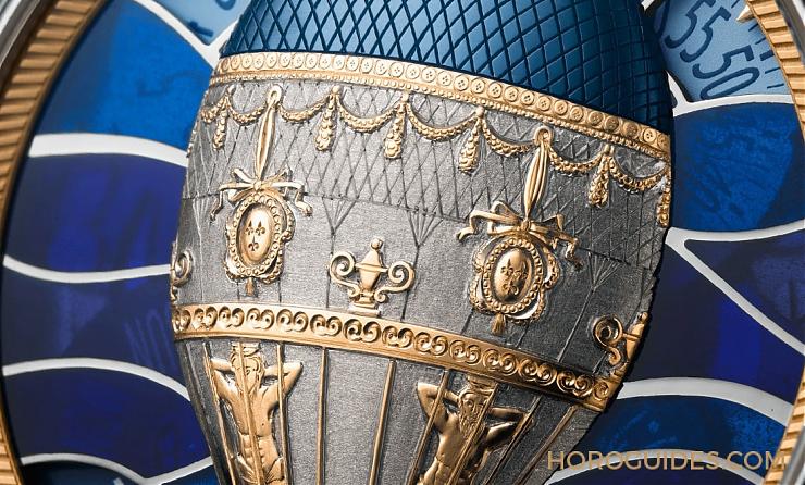 重點的熱氣球金雕極盡精致華美,尤其是半浮雕的立體感非常精彩,每換一個角度看,都可以看到不同的細節。熱氣球表面有著縫線、裝飾流蘇織物、支撐骨架以及繩索,各自擁有不同的細膩紋路,熱氣球籃筐的藤編質感、籃筐里載的人物或動物,也都是細細雕刻,每個熱氣球至少需要三個星期的時間制作。
