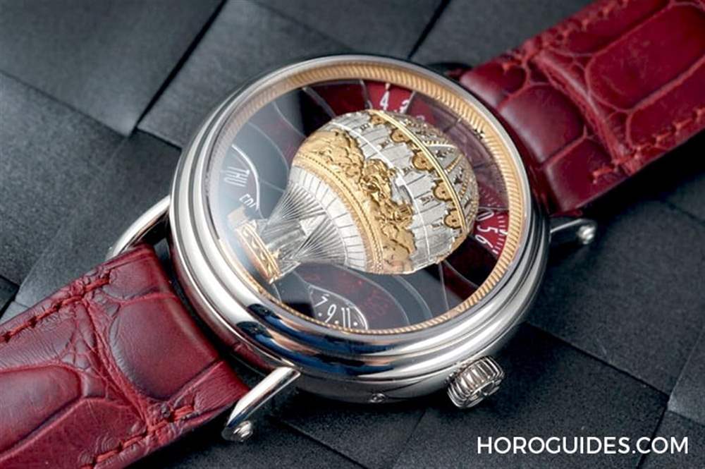 「Aérostiers」即是熱氣球,因此系列的五款腕表,以在法國完成的五次熱氣球飛行壯舉為主題,包括藍色表盤的巴黎1783、巴尼奧勒1785,綠色表盤的巴黎1784、咖啡色表盤的凡爾賽1783,以及紅色表盤的波爾多1784,各自搭配同色系鱷魚皮表帶。