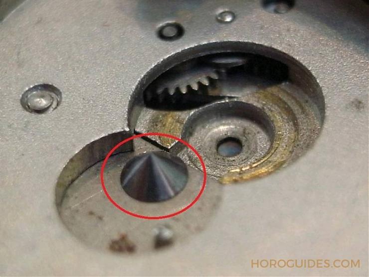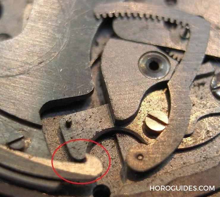 滿鏈時(shí)發(fā)條盒的上方會(huì)凸起,可借以推動(dòng)能量錐(此時(shí)會(huì)將撞陀鎖住,不會(huì)繼續(xù)上鏈,以免軸心磨損)。