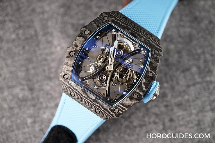 除了表殼,其實這款RM 53-01最具挑戰的就是他的表鏡部分,因為一般的藍寶石水晶玻璃表鏡雖然有一般抗刮等等的防護,但是仍舊無法應付劇烈運動帶來的沖擊,因此這款RM 53-01是RICHARD MILLE特別與藍寶石水晶專家Stettler合作,運用了在制車才會使用的層壓式藍寶石水晶表鏡,雖然表鏡經過大力敲擊仍然會裂縫,就像是防彈玻璃一樣,但是并不會像一般藍寶石水晶玻璃會完全碎裂,進而保護到內部機芯以及佩戴者的安全。